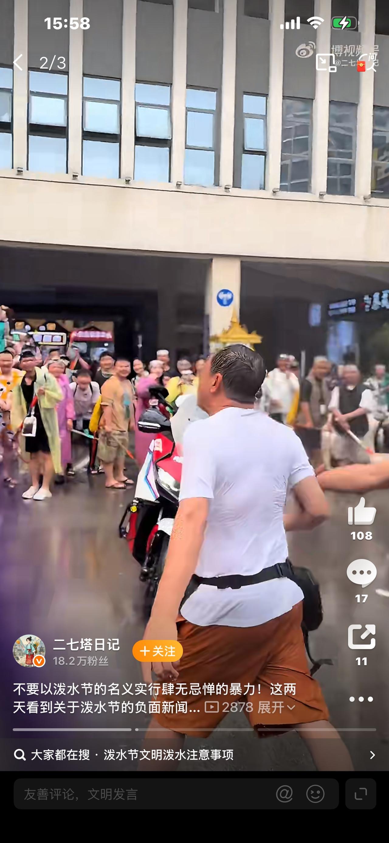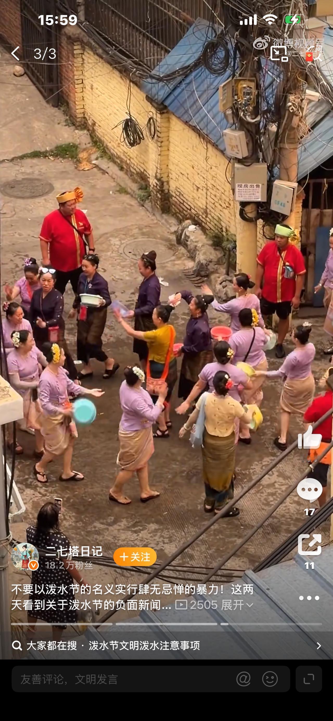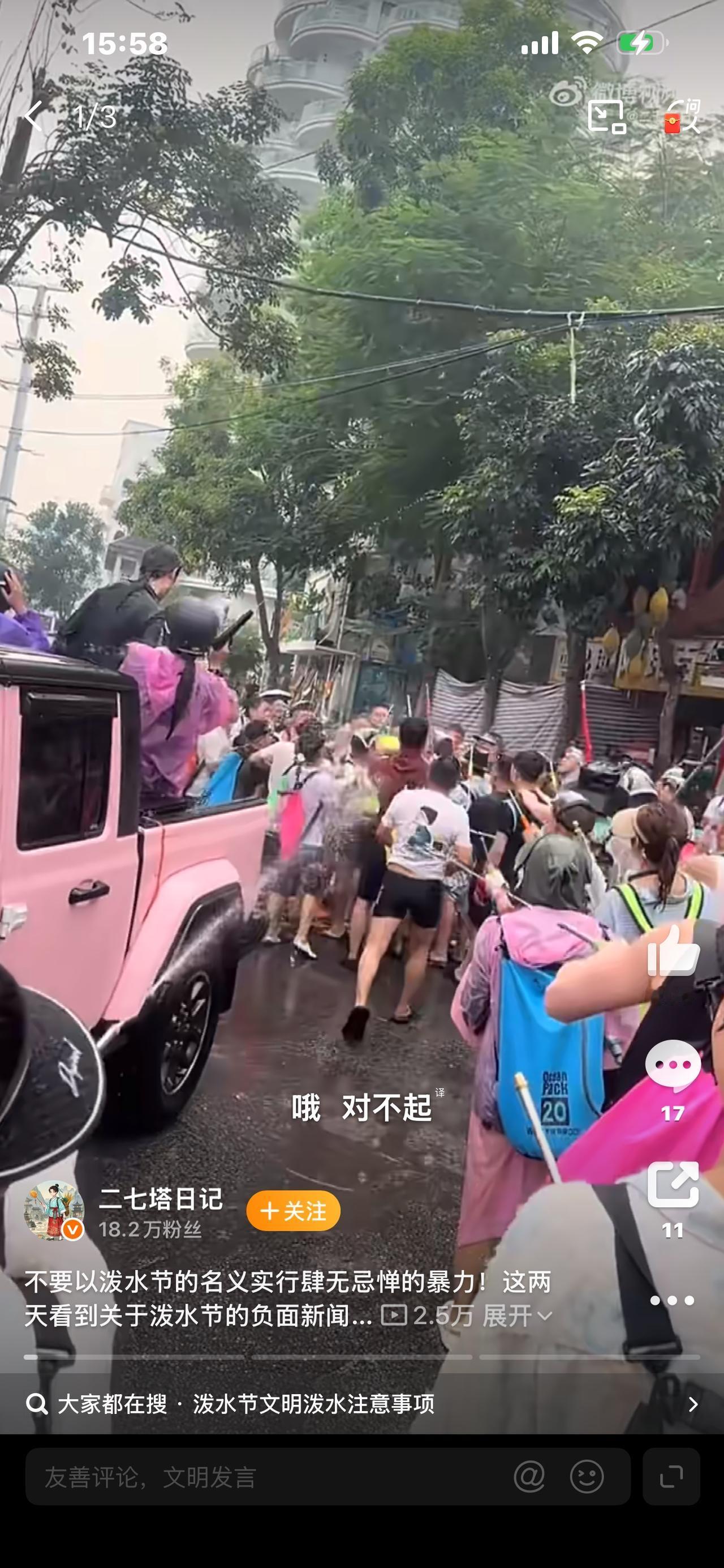 泼水节变味!从“浴佛祈福”到“水炮欺凌”,谁把千年民俗搞砸了? 你以为的泼水节,是傣族新年用枝叶蘸水、轻洒肩背的祝福,是洗去尘埃、迎吉祥的暖心仪式;可现实里的泼水节,却变成了高压水枪围堵、强拉车门灌水的“施暴现场”,甚至连老人、孕妇都成了恶意攻击的对象。 这几天,泼水节变味 冲上热搜,画面让人头皮发麻:两名女子骑电动车路过,连连摆手拒绝,却被人持高压水枪围堵狂喷,有人蹲在路边痛哭;一家四口自驾出游,关紧车窗只想慢慢通过,却被人强行拉开车门、掰开后备箱,高压水炮疯狂往里灌,新车短路冒烟,60多岁老人全身湿透、瑟瑟发抖。更离谱的是,还有人往水里掺冰块、泥沙,甚至对准女性私密部位喷射。 明明是承载祝福的传统,怎么就成了无底线的狂欢? 转折点来了:这根本不是“热闹”,而是文化被流量与私欲彻底绑架。 首先是工具暴力化。传统的贝叶枝、银碗,被改装高压水枪、巨型水气球取代,压力高达2-3兆帕,射程8米,足以造成角膜损伤、耳膜穿孔,2026年已接诊17例眼伤患者,2人出现永久性视力损伤。 其次是边界践踏化。“不泼老人、孕妇、拒绝者”的传统规矩被抛之脑后,“拒绝就是玩不起”的强盗逻辑横行,从“互泼祝福”异化为“群体围攻”,连行驶车辆、路人都成了目标。 最后是流量扭曲化。营销号刻意炒作“湿身诱惑”“颜值越高被泼越狠”,把越界行为包装成“节日特色”,掩盖采花祈福、浴佛祈福的文化内核。而官方《文明泼水倡议书》年年发,却因执法缺位、取证难,沦为一纸空文,让“法不责众”成为乱象的温床。 结尾共鸣:别让恶意毁了民俗,泼水节本应温暖人心。 泼水节的初心,是以水为媒,传递善意。它不该是肆意发泄的借口,更不该是践踏规则的挡箭牌。 我们怀念的,是傣寨里长者主持的浴佛仪式,是街坊邻里间轻洒清水的温情,是用文化滋养心灵的纯粹。 愿泼水节早日回归本真,让文明泼水成为共识;愿我们都能守住底线,用尊重替代恶意,用祝福代替伤害——毕竟,真正的“泼水节”,从来不是泼得越狠,祝福越深,而是以水净心,以爱传情。云南泼水节
