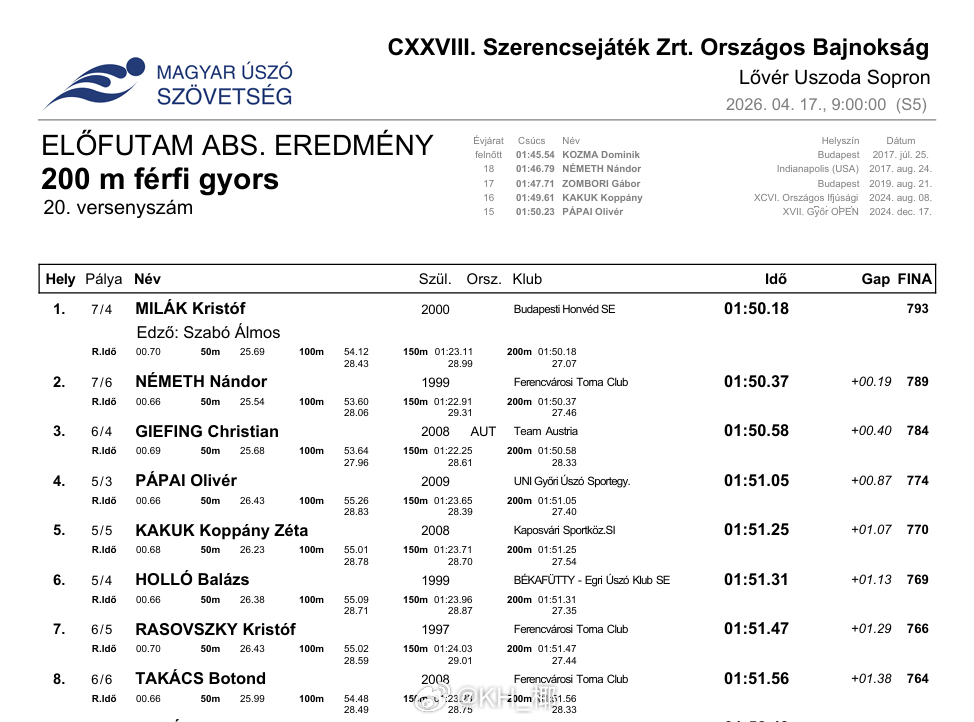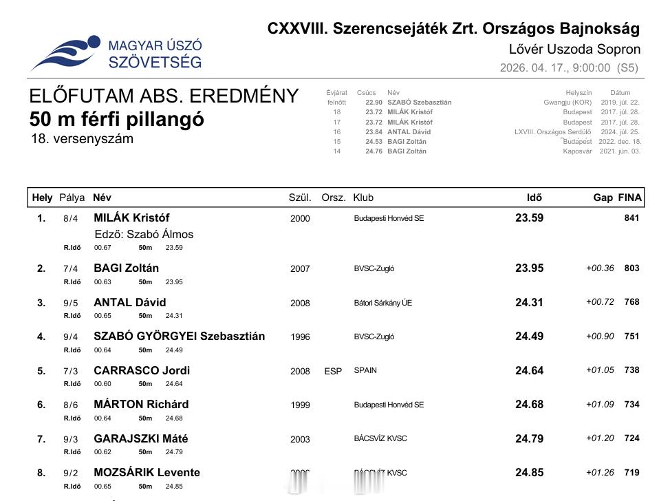 匈牙利游泳锦标赛 今早预赛,大米50蝶和200自均以预赛第一晋级半决赛