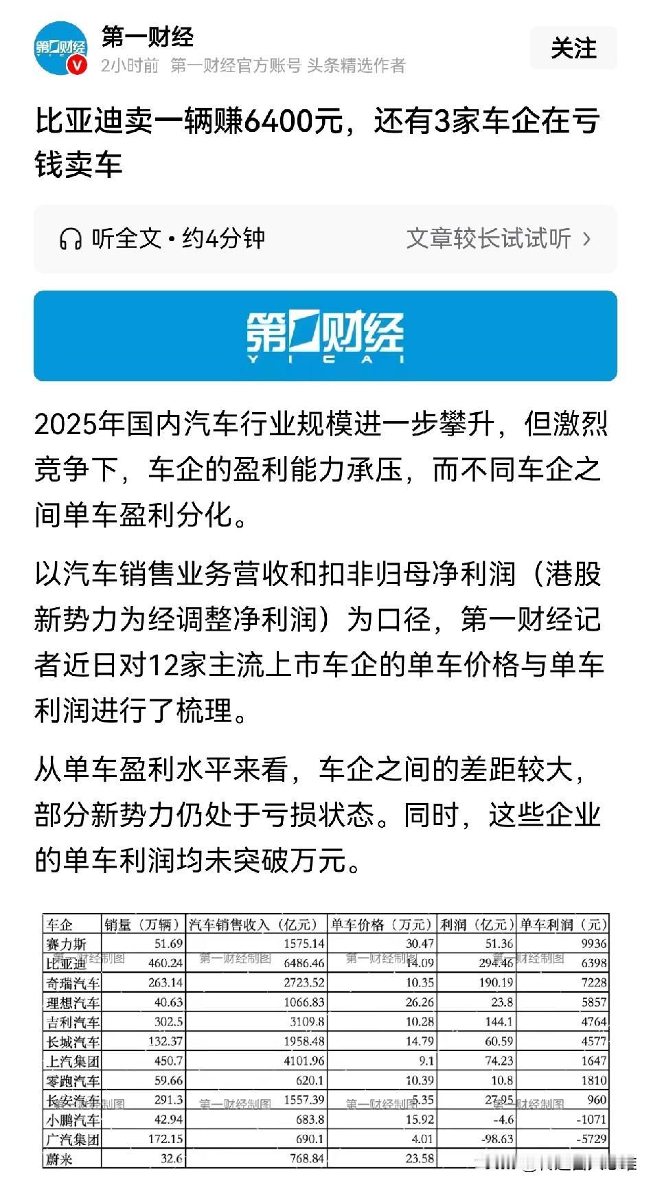 车企真是卷到边了,卖一辆三四十万的车才赚几千块钱,那种几万块一辆的车利润就几百块钱…还有好几家车企卖一辆亏好几千甚至几万。看来国内的竞争确实激烈,还有一个原因就是国内一些车企不自信,给自己的产品定价太低,明明自己的车很好,技术非常硬,就非要把价格定的很低卖,真是伤敌一千自损八百!