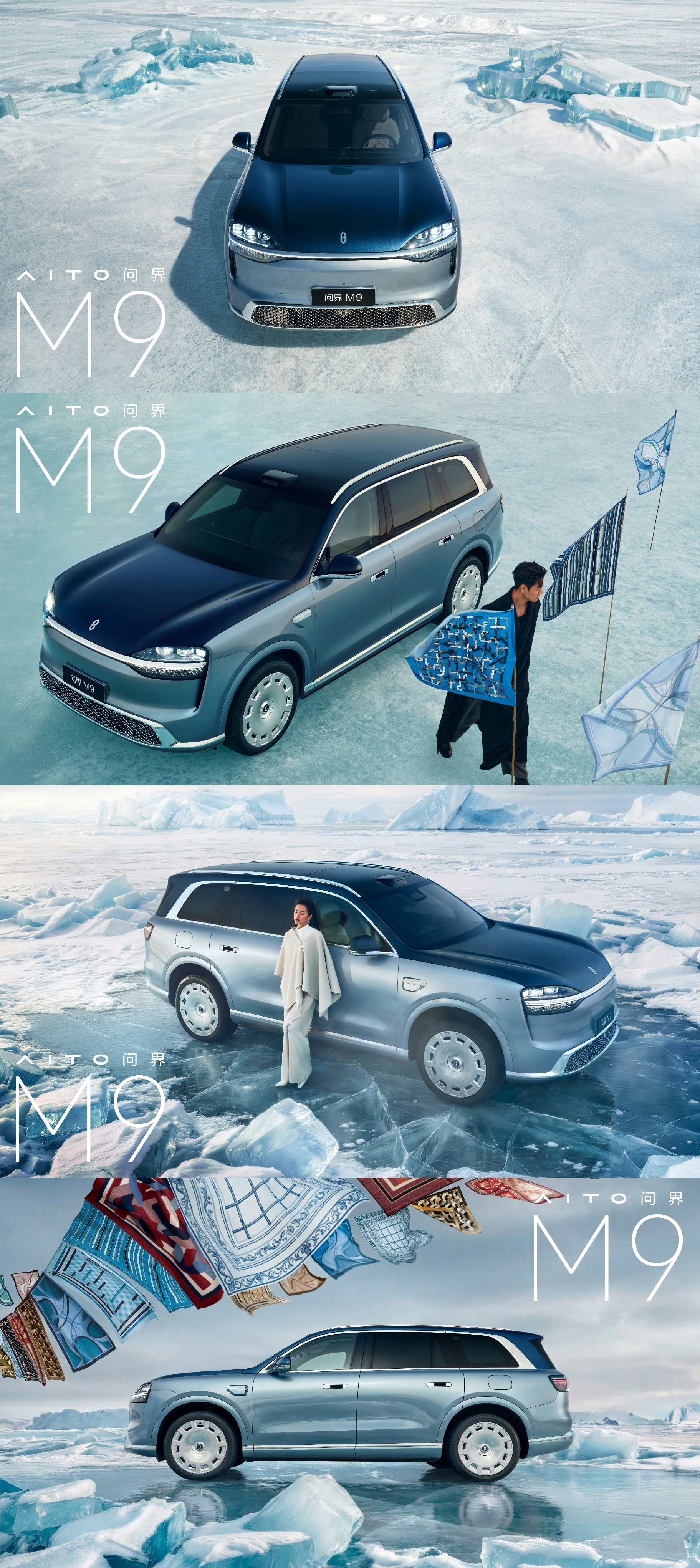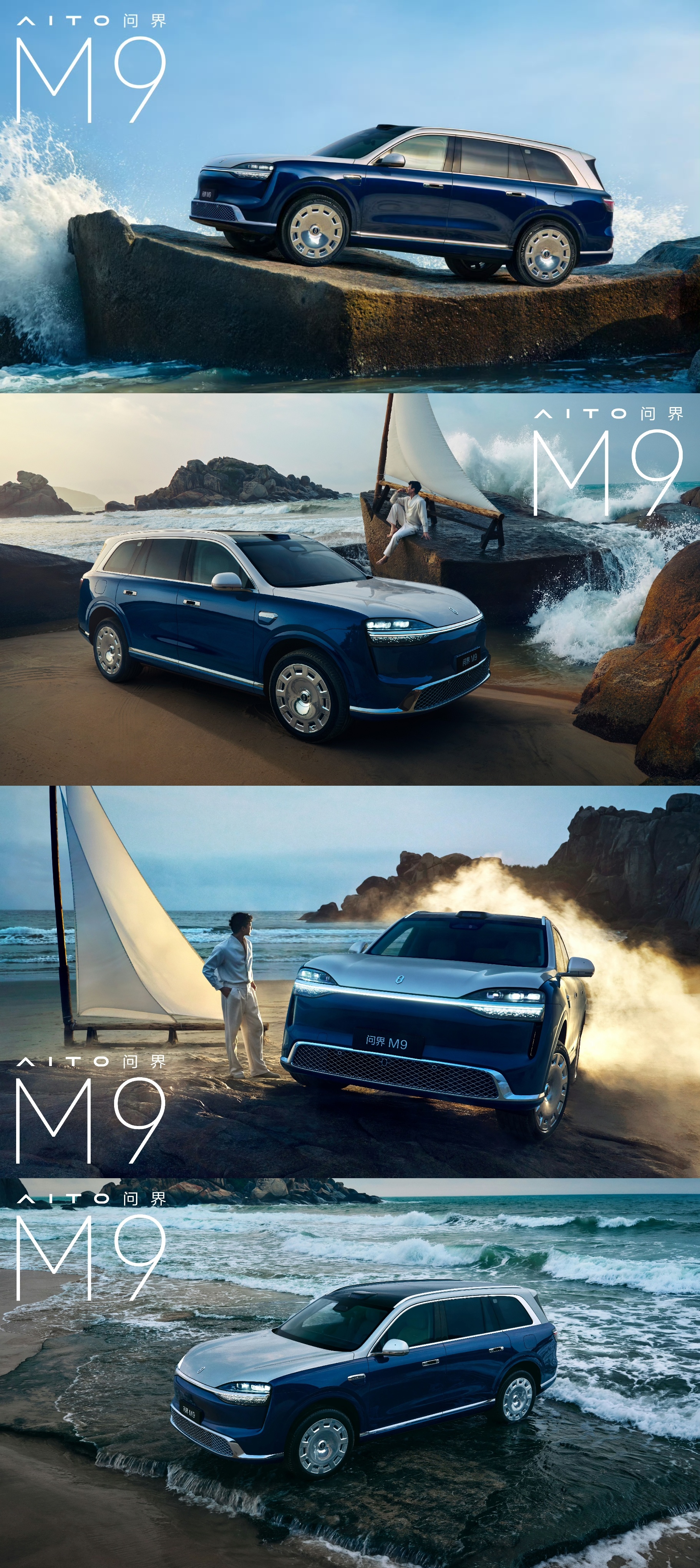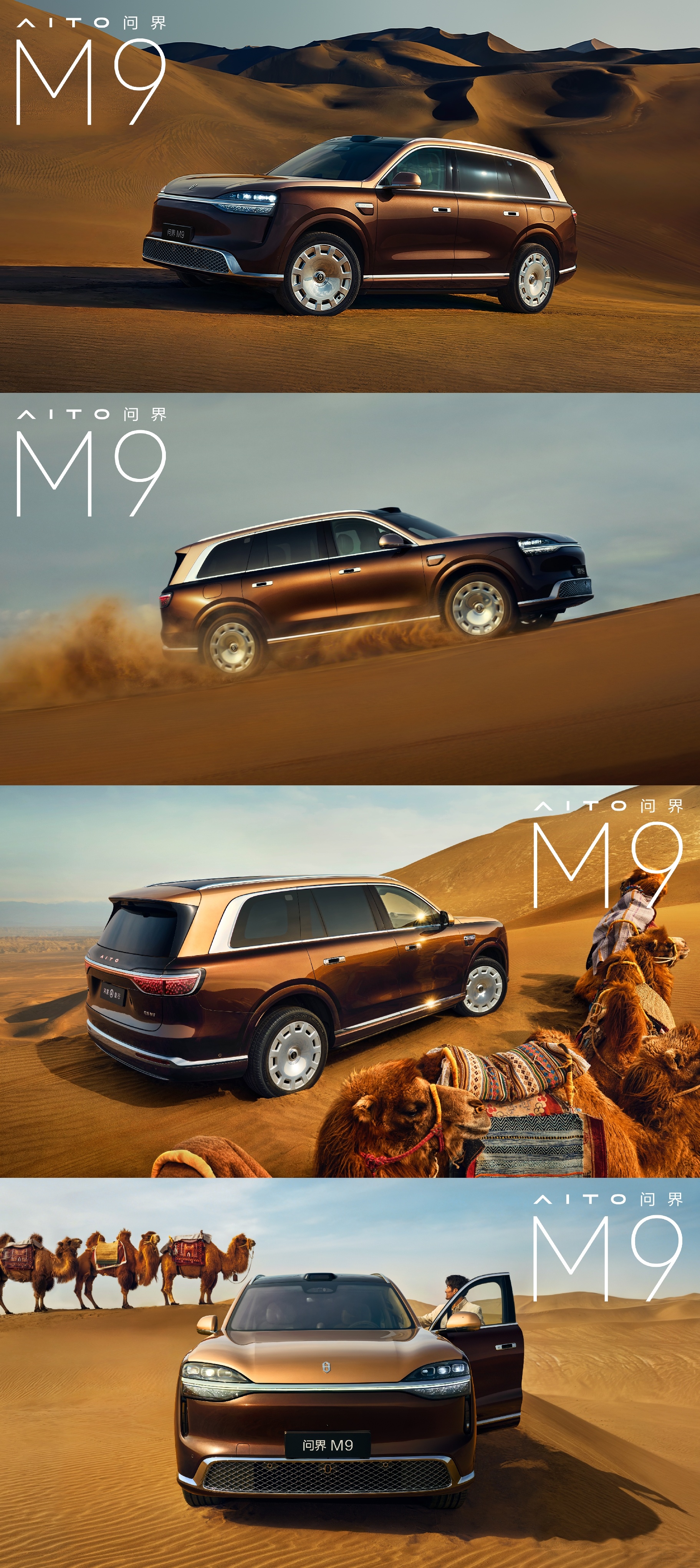 全新一代问界M9三款全新配色:大漠金棕、赛里木青、沧海银蓝。