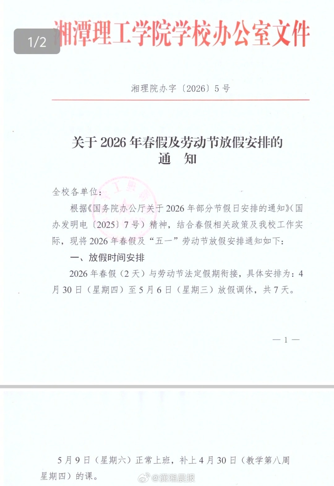 【#湘潭理工学院回应放春假#】湖南的大学生也有春假了!4月17日,湘潭理工学院发布《关于2026年春假及劳动节放假安排的通知》,表示学校将于4月30日和5月6日放春假,与劳动节法定假期衔接,连休7天。根据湘潭理工学院的放假安排,2026年春假(2天)与劳动节法定假期衔接,具体安排为:4月30日(星期四)至5月6日(星期三)放假调休,共7天。5月9日(星期六)正常上班,补上4月30日(教学第八周星期四)的课。湘潭理工学院相关人员回应“这是湘潭理工学院首次给学生放春假”,据了解也是湖南首个官宣放春假的高校。 湘潭