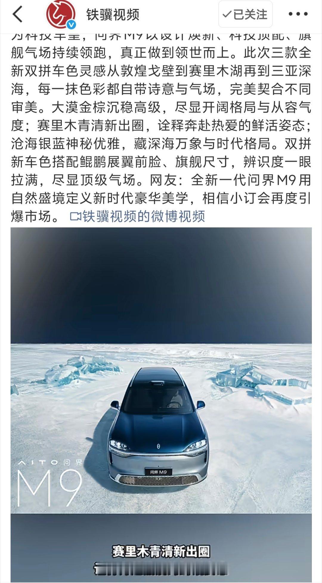 问界M9三款双拼新色官宣 这次M9的三款双拼新色,与其说是简单的颜色上新,不如看作是一次对车身光影结构的重新梳理。大漠金棕、赛里木青、沧海银蓝,三组配色都遵循了上浅下深或上深下浅的逻辑,用色彩分割进一步强调了肩线的视觉延展感。双拼工艺在量产环节中对喷涂遮蔽和交界线平整度要求更高,看得出是想在不动钣金的前提下,靠涂层工艺来提升体量精致度。4月22日亮相小订,实车接缝处的细节处理值得一看。