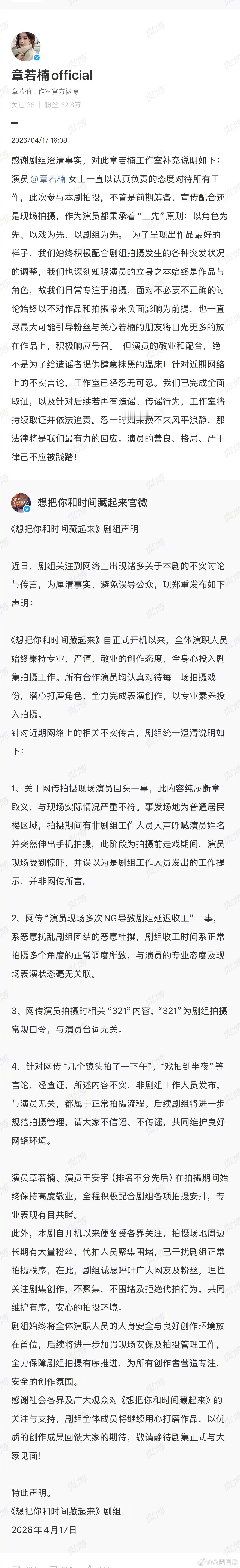 章若楠工作室发文:针对近期网络上的不实言论,工作室已经忍无可忍。我们已完成全面取证,以及针对后续若再有造谣、传谣行为,工作室将持续取证并依法追责