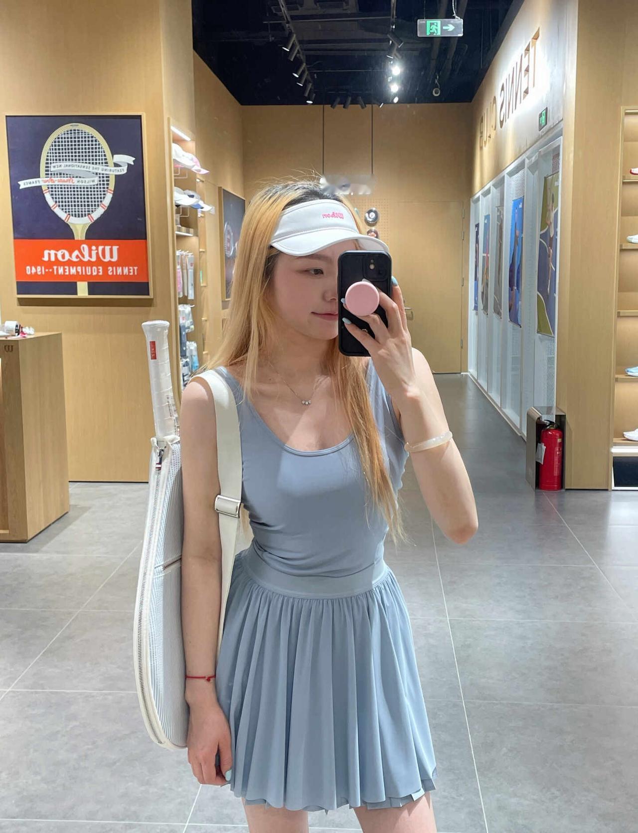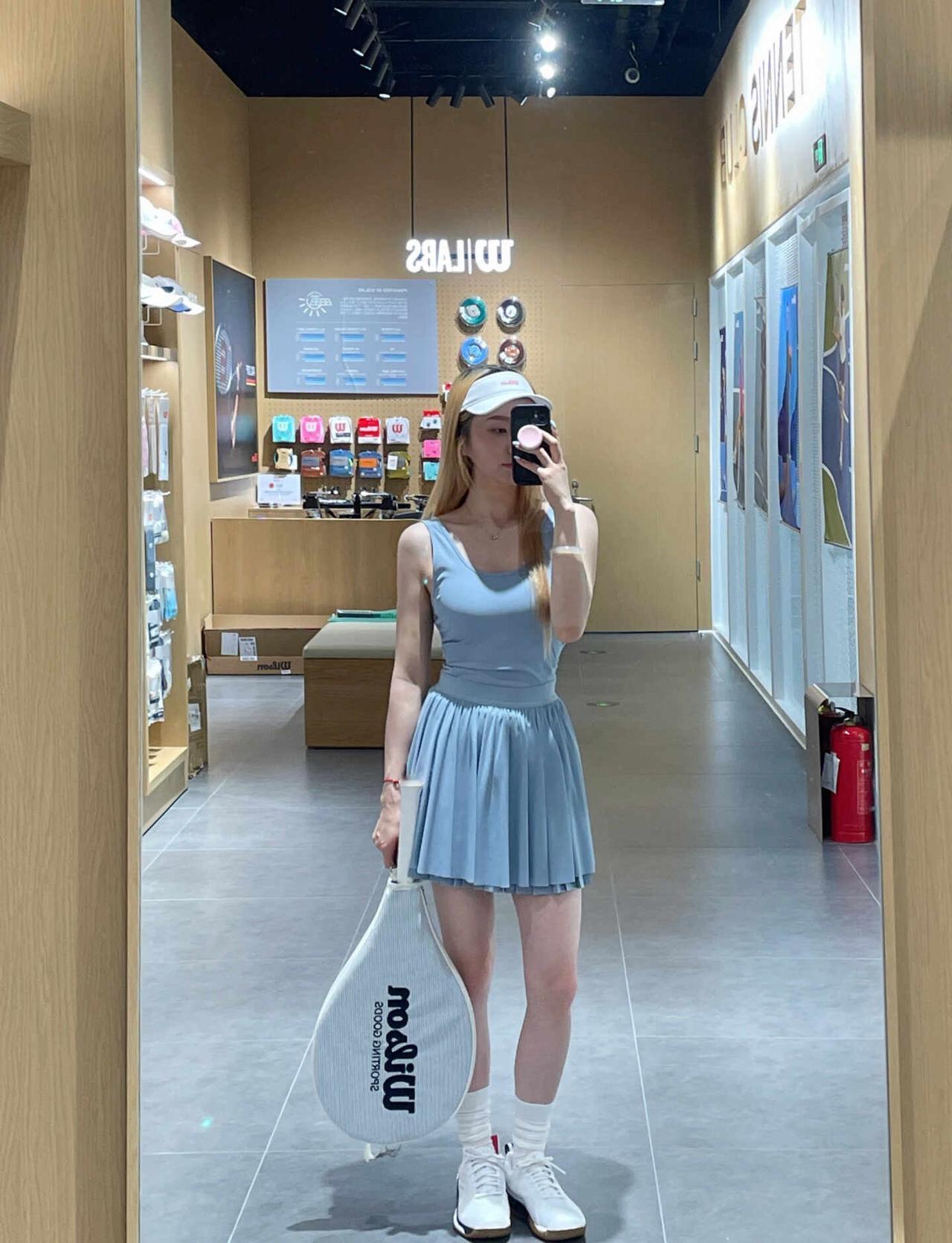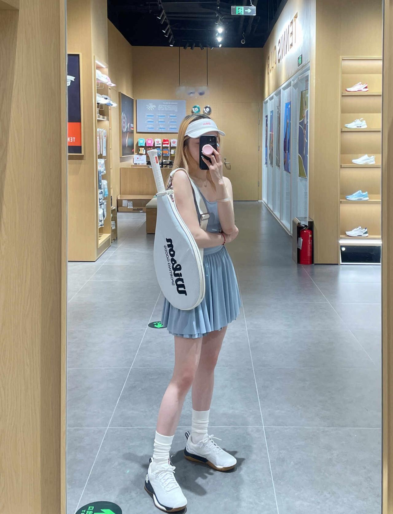 Tennis club 日常|低饱和运动穿搭 低饱和色系的网球套装,是不费力的时髦感 百褶裙+小白鞋,搭配Wilson的经典拍包 在门店镜子前随手拍,自带韩系氛围感 运动风也能穿出清冷又温柔的感觉 网球风穿搭 低饱和穿搭 ins风运动服 Wilson威尔胜 网球女孩