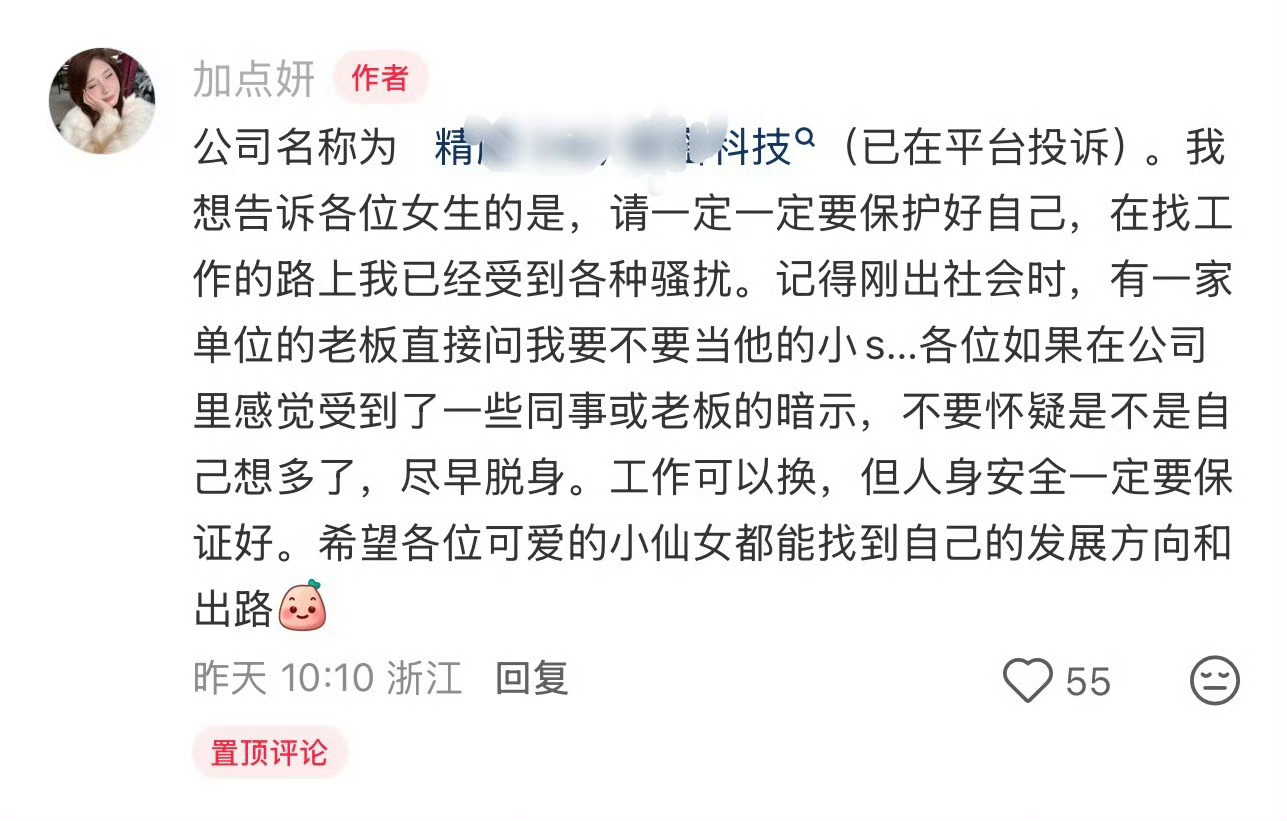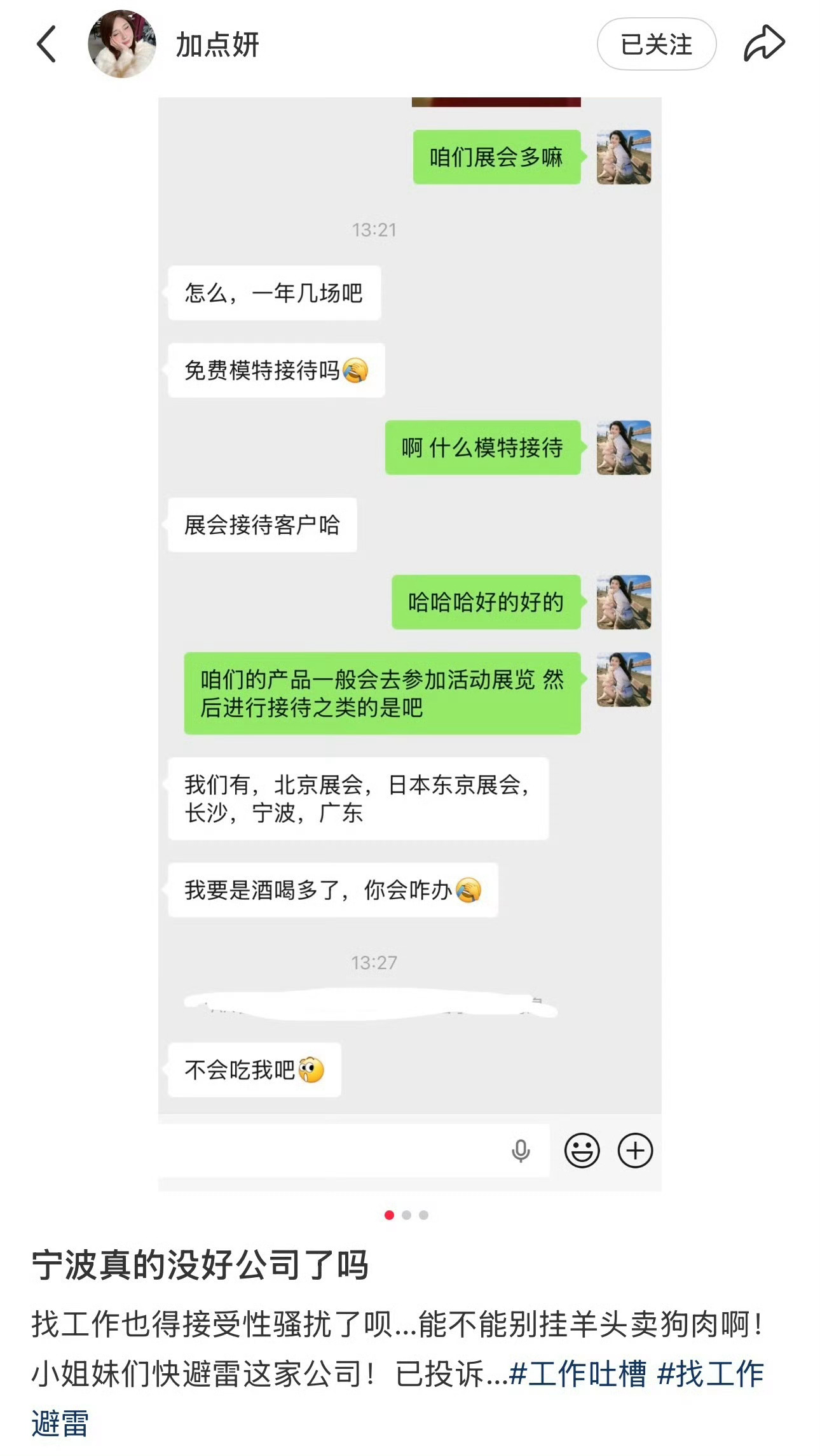 宁波女网友面试对方问如果我喝了酒你不会吃我吧 网友“加点宴”发帖吐槽:宁波真的没好公司了吗找工作也得接受性骚扰了呗…能不能别挂羊头卖狗肉啊!小姐妹们快避雷这家公司!