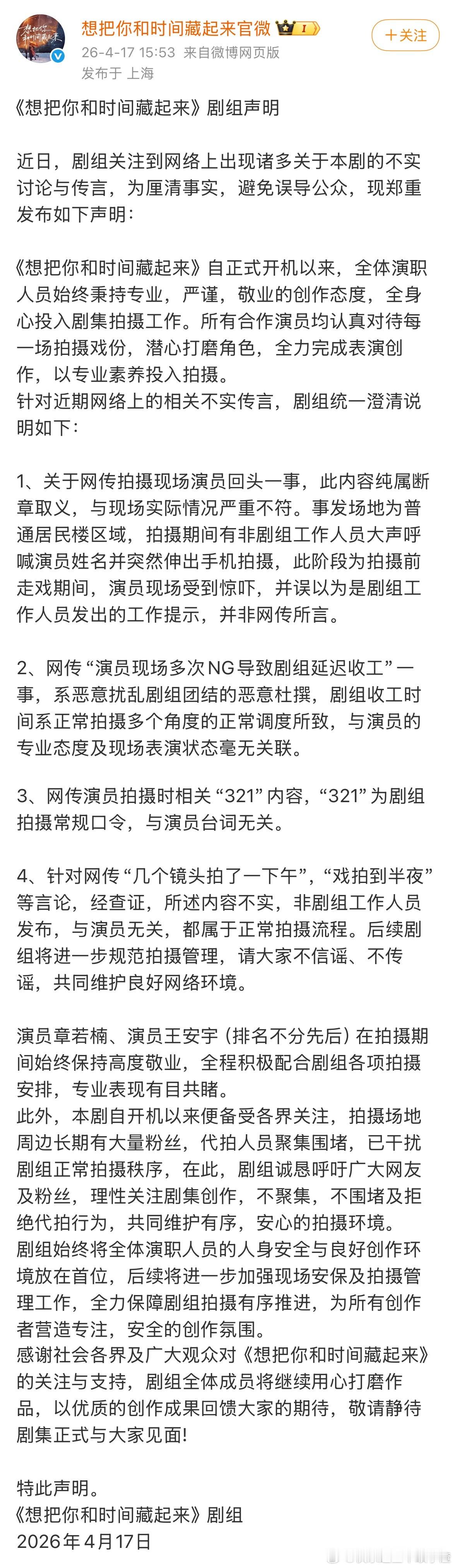 章若楠王安宇《想把你和时间藏起来》剧组声明来了