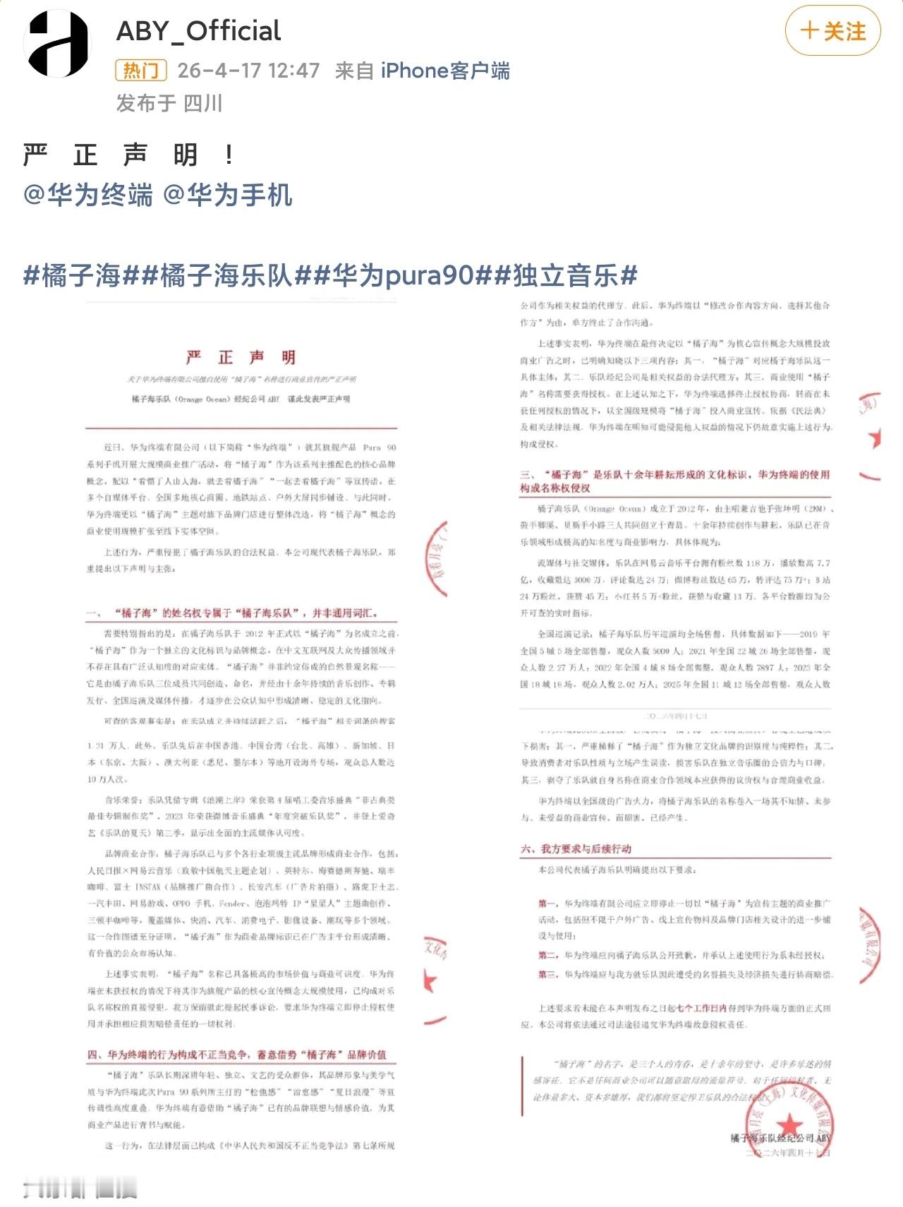 橘子海乐队称华为侵权问题是“橘子海”这个词不是华为先起的,各地风景文旅早就有了,“橘子海”说的是风景的一个颜色称呼,国家是否应该出台法案:风景名和地名不可注册。如果没有,那他们就没有垄断橘子海三个字的权利。因为橘子海是很多地方宣传自然风光的用语,并不具备显著性。橘子海乐队总不能喊属地文旅和游客禁止用橘子海吧?