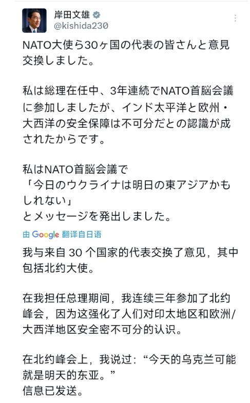4月16日,日本前首相岸田文雄发了条文,看了真让人来气。 他说当天和北约大使、30个国家的代表聊了天,还炫耀自己当首相时,连续三年去参加北约峰会。 最可恨的是,他还扯谎说“今天的乌克兰,或许就是明天的东亚”,明摆着煽风点火,卸任了都不安分,没安半点好心。 有人可能会问,一个卸任的前首相,咋还盯着这事不放?其实根本不是岸田闲得慌,而是日本这些年一直憋着坏——想打破二战后定下的规矩,偷偷搞军事扩张,攀附北约、说这些鬼话,都是他们找的借口。 先说说岸田炫耀的“连续三年参加北约峰会”,这真不是啥光荣事。北约本来是欧洲和北美国家搞的军事圈子,管的是欧洲和大西洋的安全,跟咱们东亚、印太地区半点关系没有。 日本是亚洲国家,还是二战战败国,按说该安安分分,离这种军事圈子远点,可它偏不,上赶着凑上去,说白了就是抱西方的大腿,想让北约给它撑腰。 岸田还嘴硬,说这么做是因为“印太和欧美安全分不开”,这话纯纯是瞎扯。说白了,就是日本玩冷战那一套老把戏,故意挑事、制造地区矛盾。 啥安全分不开,本质就是想把北约这个军事组织拉到印太来,有北约撑腰,它搞军事扩张、打破规矩,就有了“借口”,别人也不好多说。 再说说他最招人烦的那句话,“今天的乌克兰,或许就是明天的东亚”,纯属制造恐慌、煽风点火。咱明明白白说,乌克兰的情况和东亚压根不一样,没有半点可比性。 乌克兰的问题很复杂,而咱们东亚一直是和平发展,各国都在好好合作,根本不可能变成下一个乌克兰。 岸田反复说这话,目的特别简单,就是想让大家觉得东亚不安全,这样日本就有理由扩军、打破规矩。大家看看日本这些年的所作所为就知道,它可不是随口说说。 日本的军事预算已经连续14年上涨,2026年更是涨到了9.04万亿日元,全花在搞军事上;还偷偷改导弹、改军舰,搞那些能打很远的进攻性武器,根本不是所谓的“自卫”,就是在搞军事扩张。 有人会问,日本一个战败国,咋敢这么明目张胆?一是美国默许、支持它,想让它当自己在印太的“马前卒”,所以不断给它松绑;二是日本自己野心大,二战结束这么多年,一直想摆脱战败国的帽子,搞成军事大国。 岸田卸任了还煽风点火,就是想帮日本扩军造势,还想让现任首相也去参加北约峰会,让北约更深入介入印太。 其实日本这么做,只会破坏东亚的和平,加剧紧张,最后受害的还是老百姓,而且它不反省战争罪行,一门心思扩军,也是对亚洲人民的不尊重。 最后咱说句实在的,不用被岸田的鬼话吓住,东亚的和平不是他一句话能破坏的,但也得提高警惕。 日本的野心藏不住,要是继续执迷不悟搞扩张、煽风点火,最后肯定是搬起石头砸自己的脚。我们只要看清它的真面目,守住咱们的和平生活就好。