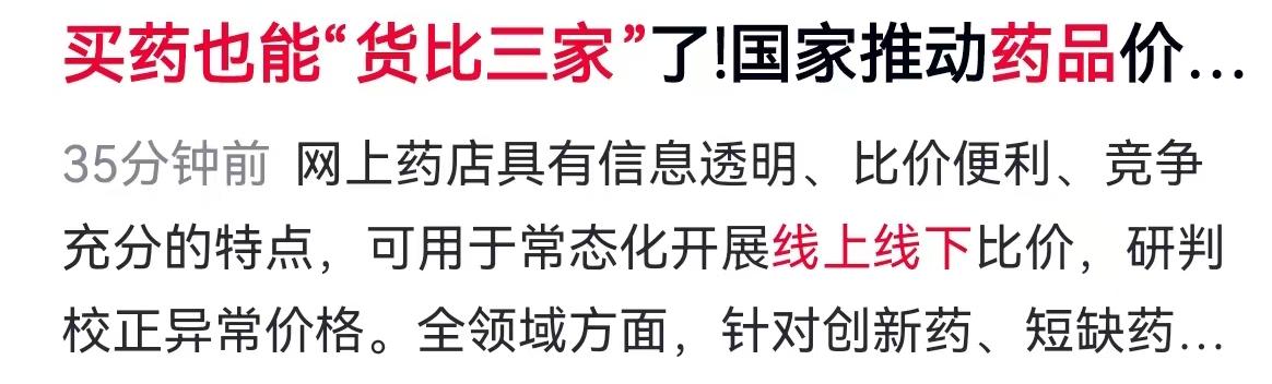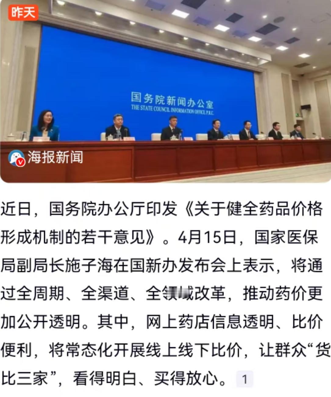 去菜市场买把小葱人们都知道多走两家摊位问问价,轮到买动辄几十上百的处方药,绝大多数人往往是拿了药单直接掏钱,连个价都不敢问。这种长期存在的信息差,马上要被彻底打破了。4月15日,国新办发布会上传出一个跟所有人钱袋子息息相关的消息,国家医保局副局长施子海明确表态,要在全周期、全渠道、全领域推动药品价格改革,核心就是四个字:公开透明。 就在这场发布会前不久,国务院办公厅刚刚印发了《关于健全药品价格形成机制的若干意见》。这份文件不是泛泛而谈,里面直接定下了不同种类药品的“定价规矩”。那些砸了巨资研发出来的高水平创新药,政策给了非常明确的定心丸,上市初期允许制定跟研发投入相匹配的价格,短期内不让它卷价格战,得让药企有动力继续搞真创新。进了医保目录的常规药,则以支付标准作为无形的手去引导价格,集采药品继续优化规则把水分挤干。至于那些挂网的药品,则划定了自主定价的清晰边界,动态调整制度会一直跟在后面盯着。 普通老百姓最能直接感受到的,是价格监测工具的真刀真枪落地。过去买药贵,很大一部分原因出在渠道上。同一个厂家的同一盒药,街角这个药店卖35,过了两条街那个药店就能卖50,消费者被蒙在鼓里。现在国家直接把网上药店信息透明、比价便利的特点利用到了极致,常态化开展线上线下比价。各省正在密集上线医保药品比价小程序,打开手机,输入药名,周边几公里内哪家药店有货、卖多少钱、离你家多远,按价格排序或者按距离筛选全由你自己定。网上那种竞争充分的环境,正好用来研判校正线下实体药店的异常价格。 公立医院这块的规矩也立得明明白白。除中药饮片外,公立医院里所有的药品全部实行零差率销售。这几个字翻译成大白话就是,医院进价多少钱,卖给患者就多少钱,中间哪怕加一分钱都属于违规。医院彻底退出药品利润的分成,回归纯粹的治病角色。 这套“三全”改革组合拳打下来,市场的逻辑彻底变了。买药不再是开盲盒。消费者手里有了比价小程序,等于掌握了主动权,哪家药店还在靠信息不对称赚高毛利,很快就会被用脚投票的市场淘汰。站在药店和药企的角度,与其抱怨利润被压缩,不如把心思花在提升服务质量、优化库存周转上。站在医保部门的角度,用技术手段让数据跑路代替群众跑腿,把定价机制摆到太阳底下,这不仅是帮老百姓省钱,更是把整个医药零售市场的游戏规则重新洗了一遍。下次再去药店拿药,不妨先掏出手机搜一下,你省下的每一笔真金白银,都是这场改革带来的最实在的红利。 以上内容仅供参考和借鉴
