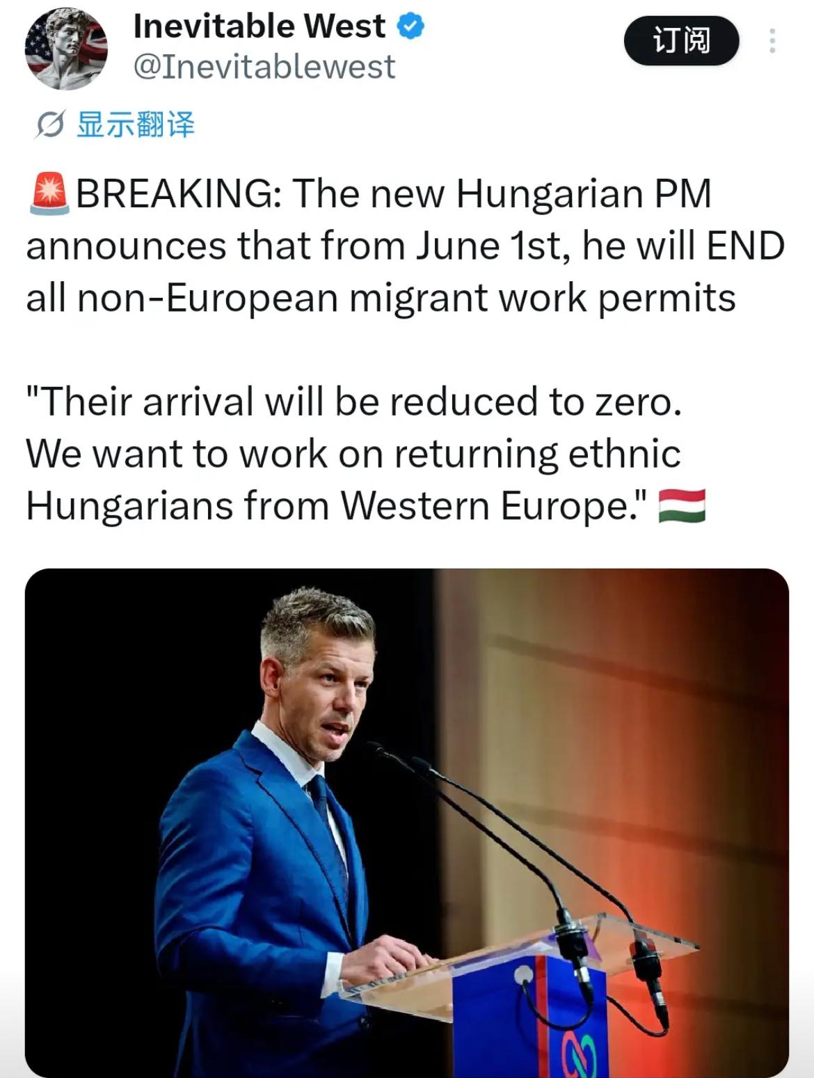 匈牙利新任总理宣布,从 6 月 1 日起,他将终止所有非欧洲籍移民的工作许可。 说几句:这一纸禁令,直接掐断了超10万外籍劳工的生计。匈牙利目前约有10.6万外籍劳工,近6万来自越南、中国、菲律宾等非欧洲国家,汽车制造、电池厂等生产线,一半岗位都靠这些人撑着。政策一落地,匈牙利制造业将首当其冲。当地劳动人口每年减少1.5万人,本土人不愿干重活,企业过去3年招不到足够工人,才大量引进外劳,现在突然断供,多条产线面临停摆风险。 新总理表面是护本土就业,实则是向欧盟示好。此前匈牙利因移民问题被欧盟罚款,终止非欧劳工许可,能快速迎合欧盟主流态度,换取被冻结的数百亿欧元资金解冻。 这项政策看似保护本土,实则是短视之举。强行切断外劳供给,会直接冲击制造业根基,导致企业成本飙升、订单流失,最终反而会减少本土就业岗位,得不偿失。 欢迎在评论区讨论