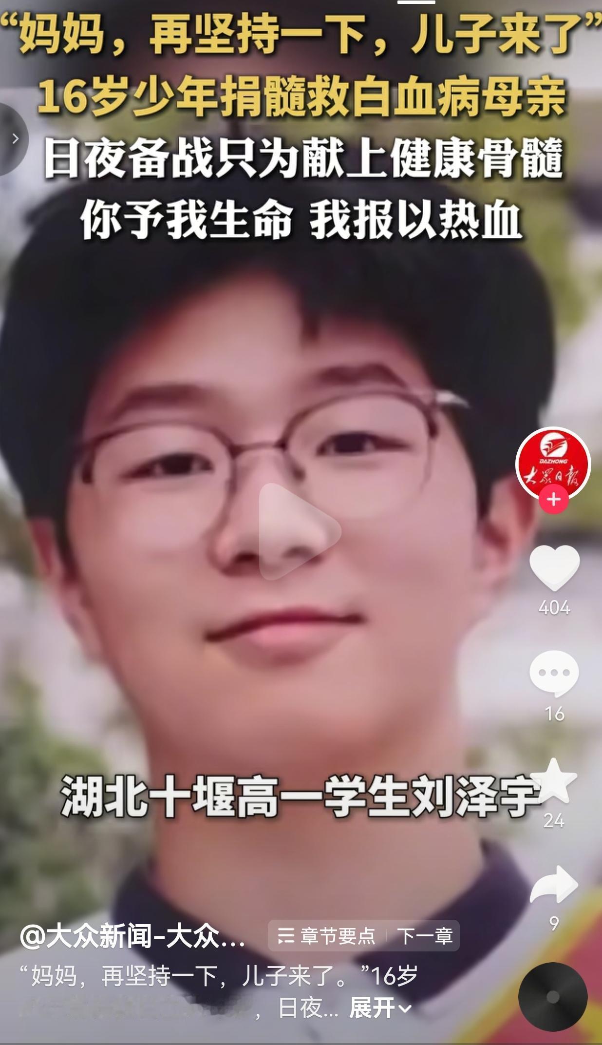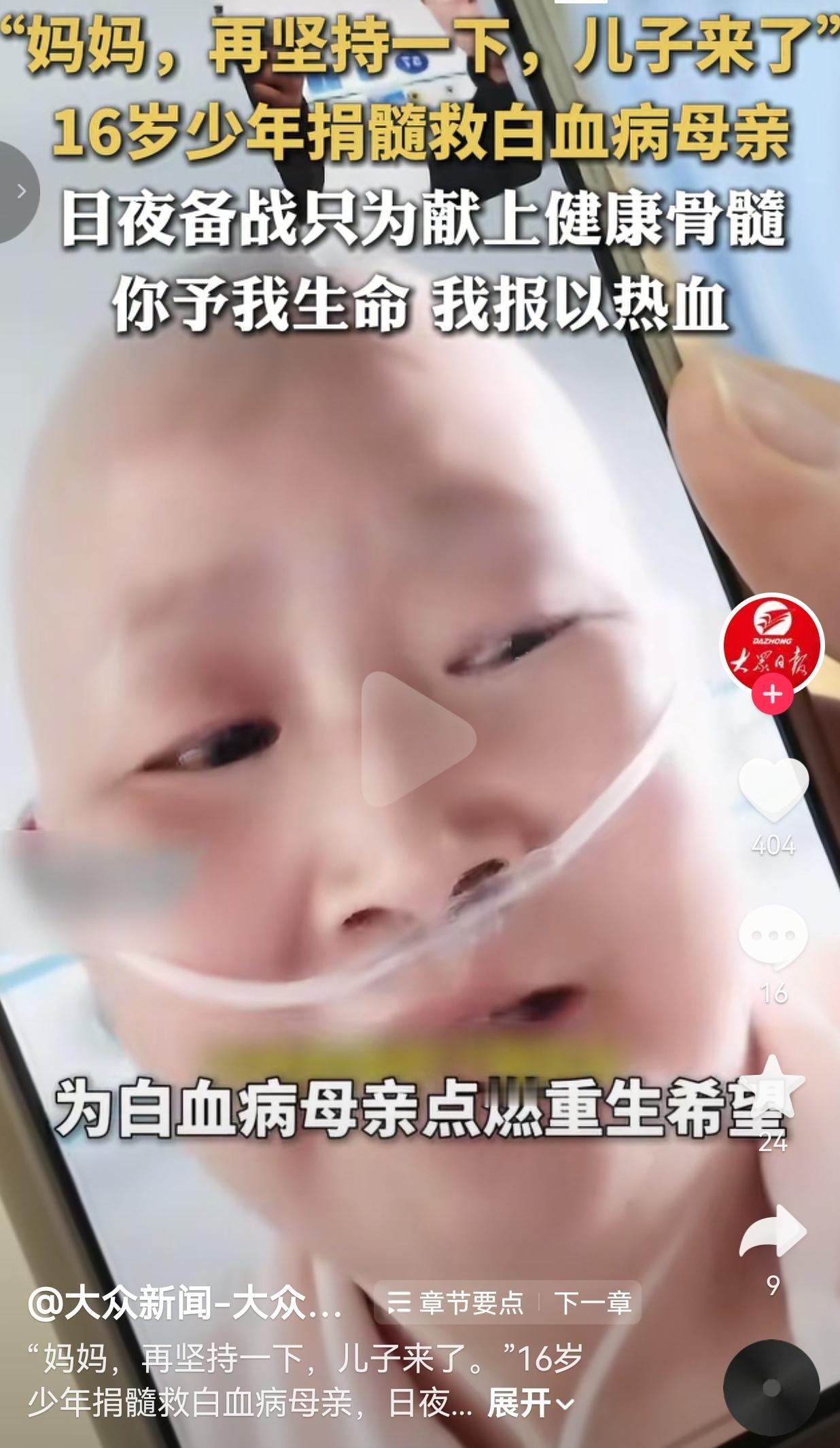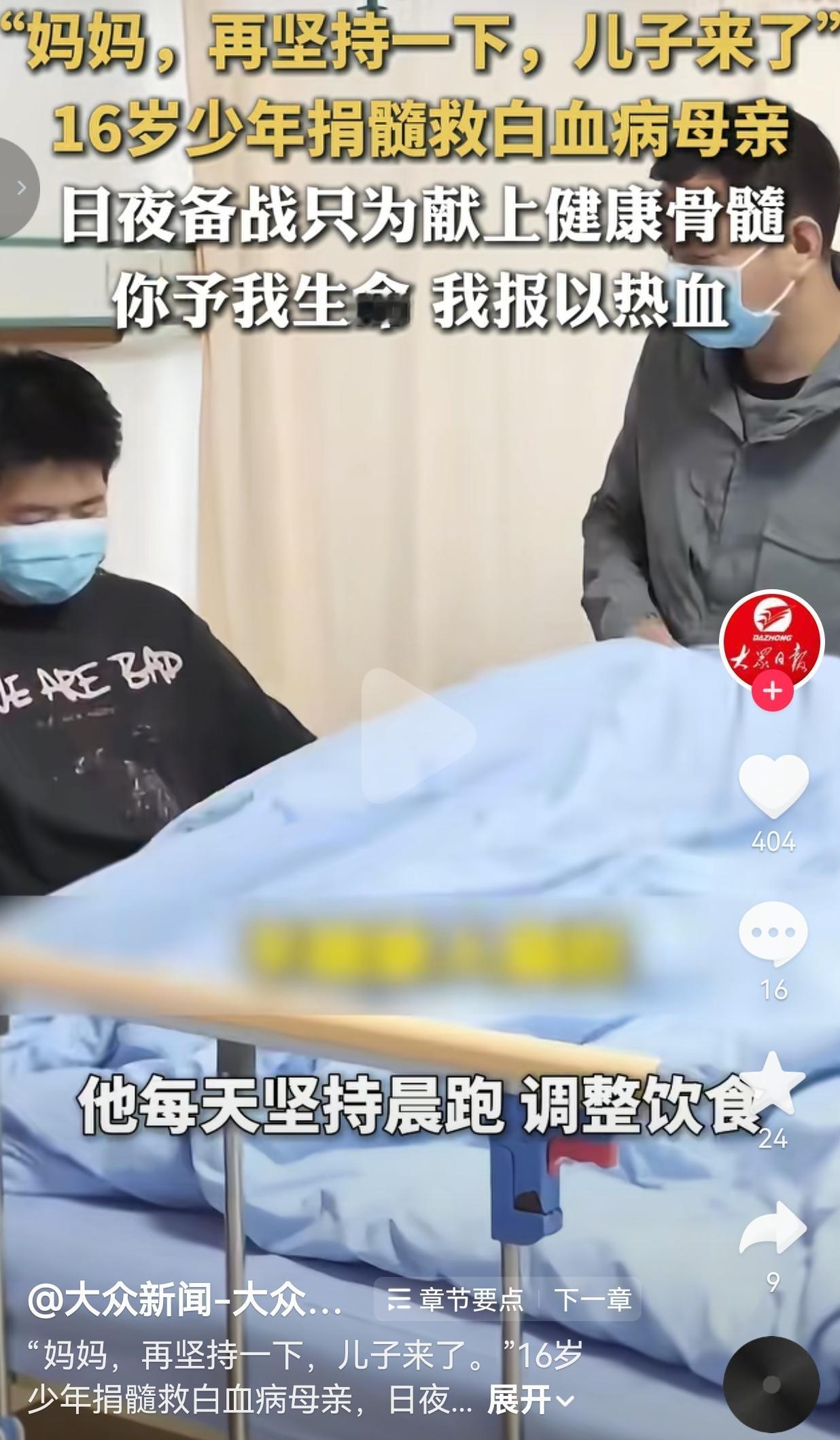 16岁少年为救白血病妈妈捐骨髓,那句“妈妈再坚持一下,儿子来了”,看哭了无数人。 事情发生在湖北十堰,16岁的高一男生刘泽宇,本来还是个连打针都怕疼的孩子,可当妈妈查出急性髓系白血病,他一夜之间就长大了。 医生说,造血干细胞移植是妈妈活下去的关键,而刘泽宇,就是家里唯一配型成功的人。 爸妈心疼他年纪小,怕他遭罪,百般阻拦,可他只说了一句话,就把所有人都说服了:“这是我妈妈,我来最合适。” 为了给妈妈献上最健康的骨髓,他开启了一场和时间赛跑的“备战”。 以前爱熬夜、爱喝饮料的少年,天不亮就爬起来晨跑,戒掉了所有坏习惯,顿顿吃健康餐,硬生生把自己的身体状态调到了最佳——他知道,只有自己够健康,妈妈才有希望。 捐献当天,粗长的针头刺入血管,整整4个小时的采集过程里,刘泽宇没掉一滴泪。 他躺在病床上,对着手机屏幕里的妈妈,一字一句地说:“妈妈,再坚持一下,儿子来了。” 采集结束后,他攥紧拳头,笑着给妈妈打气:“妈妈,我的任务完成了,你要坚强,接下来就要靠你自己了!” 妈妈现在还在无菌病房里,和排异反应抗争。可温暖从来不是单向的:学校里,老师和同学们自发组成了“补课小分队”,帮他补习落下的功课;网络上,30多位陌生网友累计捐出超万元善款,用善意托住了这个风雨飘摇的家。 网友看到后评论说: “天呐,16岁的孩子,本该还在爸妈怀里撒娇,却要扛下救妈妈的重担,太心疼了!” 也有的网友说: “这句话我看一遍哭一遍!‘妈妈,再坚持一下,儿子来了’,这哪是孩子啊,这是妈妈的救命稻草啊!” 还有的网友说:“以前总说‘养儿防老’,现在才知道,孩子对妈妈的爱,一点都不比妈妈少!” 更有网友表示: “这才是少年该有的样子!懂事、有担当,用自己的方式守护妈妈,太帅了!” 说实话,我看到这段视频的时候,眼泪直接绷不住了。 我们总说,母爱是世界上最无私的爱,可在这个16岁的少年身上,我看到了同样沉甸甸的、双向奔赴的爱。 妈妈用十月怀胎给了他生命,他用一腔热血,给了妈妈活下去的希望。 他不是不怕疼,不是不害怕,可一想到病床上的妈妈,他就什么都不怕了。 以前总觉得“长大”是个很漫长的过程,可刘泽宇用行动告诉我们,长大,可能就在一夜之间。 当妈妈倒下的那一刻,他就成了妈妈的天。这份爱,不惊天动地,却比任何誓言都动人。 原来最好的母子情,从来都是双向奔赴的守护与支撑。 最后,我想说的是:你予我生命,我报以热血;你护我长大,我守你余生。愿所有的坚持都不被辜负,所有等待都能迎来团圆。