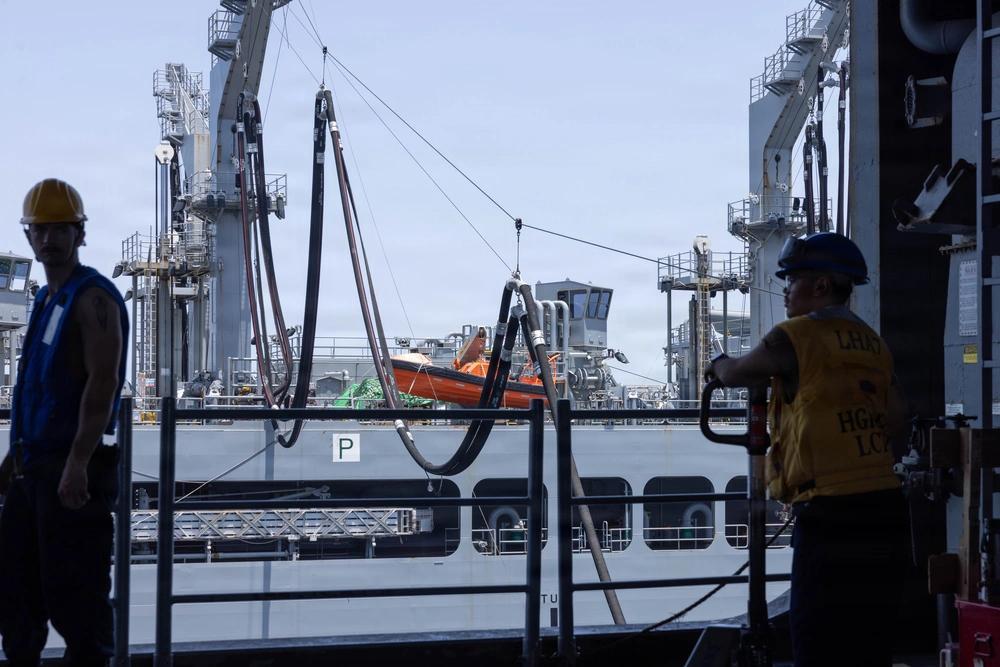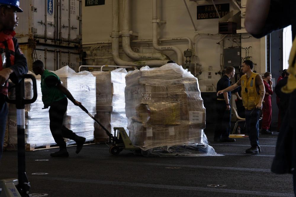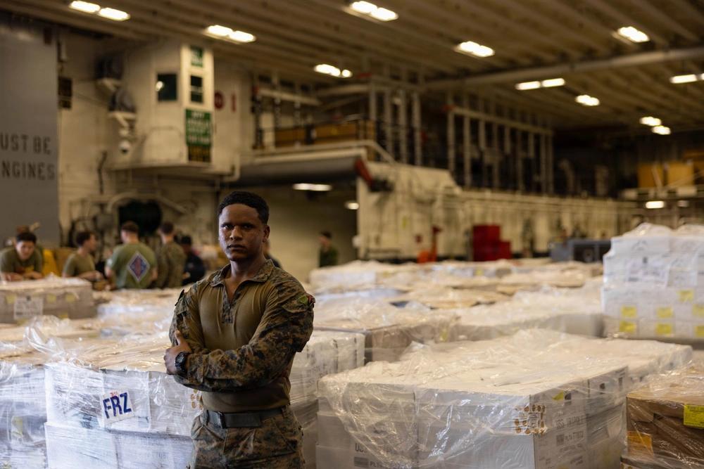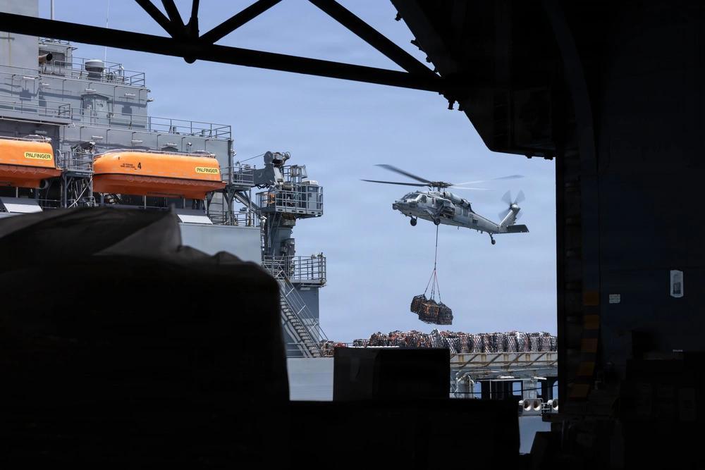 4月13日,饥肠辘辘的美军官兵终于盼来了补给。 美国海军的MH - 60S海鹰直升机,在前沿部署的两栖攻击舰USS Tripoli (LHA 7号)上开展海上补给作业,运输物资。 第31海军陆战队远征部队被部署,以支持美国中央司令部责任区的海上安全与稳定。 (美国海军陆战队照片)