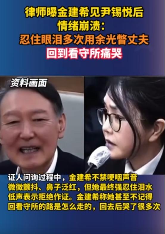 这个全程冷漠的女人回到看守所后还哭了,韩国前总统尹锡悦和金建希,9个月没见,再次见面在法庭的时候尹锡悦笑着凑上前,金建希却连正眼都不给他,这俩人到底是彻底掰了,还是有啥难言之隐? 4月14号那天,首尔中央地方法院开审尹锡悦,罪名是涉嫌违反《政治资金法》,而金建希呢,被当成证人叫到了法庭上。 这可是他俩大半年来第一次同框,本来以为就算没多亲热,也得有个眼神交流吧,结果好家伙,尴尬得能把地板抠出个洞来。 韩媒那边爆出来的消息说,庭审的时候,尹锡悦那叫一个上赶着,好几次对着金建希笑。 可金建希呢?全程摆着一张冷脸,眼睛不是盯着法庭的屏幕,就是低着头瞅法官席底下,从头至尾,就没正儿八经看过尹锡悦一眼。 就在大伙儿猜来猜去的时候,负责给他们夫妻俩辩护的律师,15号直接在社交平台上发了文,爆了个大瓜,一下就把之前的猜测全推翻了。 律师说,你们都想错了!金建希根本不是故意不理尹锡悦,她刚进法庭的时候,就偷偷用余光瞄了尹锡悦好几回。 而且作证的时候,她全程都在哭,鼻子红得不行,声音也抖得厉害,到最后,是咬着牙、用特别小的声音,说自己拒绝作证。 更让人心里不是滋味的是,律师还说,金建希作证完,一到看守所,就再也绷不住了,一次又一次地哭,哭到崩溃,根本停不下来。 律师也说了,他发这些话,不是为了让大伙儿同情他们,就是不想让媒体瞎编乱造,把俩人的关系简单说成“彻底破裂”。 尹锡悦自己官司缠身,金建希作为他的老婆,以证人的身份出庭,一边是夫妻之间的情分,一边是严肃的司法调查。 不作证会被人说无情无义;要是开口说了又怕影响案子,连累尹锡悦,她不敢正眼瞅尹锡悦,不是不爱,是真的不敢;偷偷用余光瞄,不是冷漠,是藏在心里的牵挂,没处安放。 信息来源:观察者网《韩媒称金建希拒与尹锡悦对视,律师回应:她用余光在看,回看守所还哭了》2026-04-16