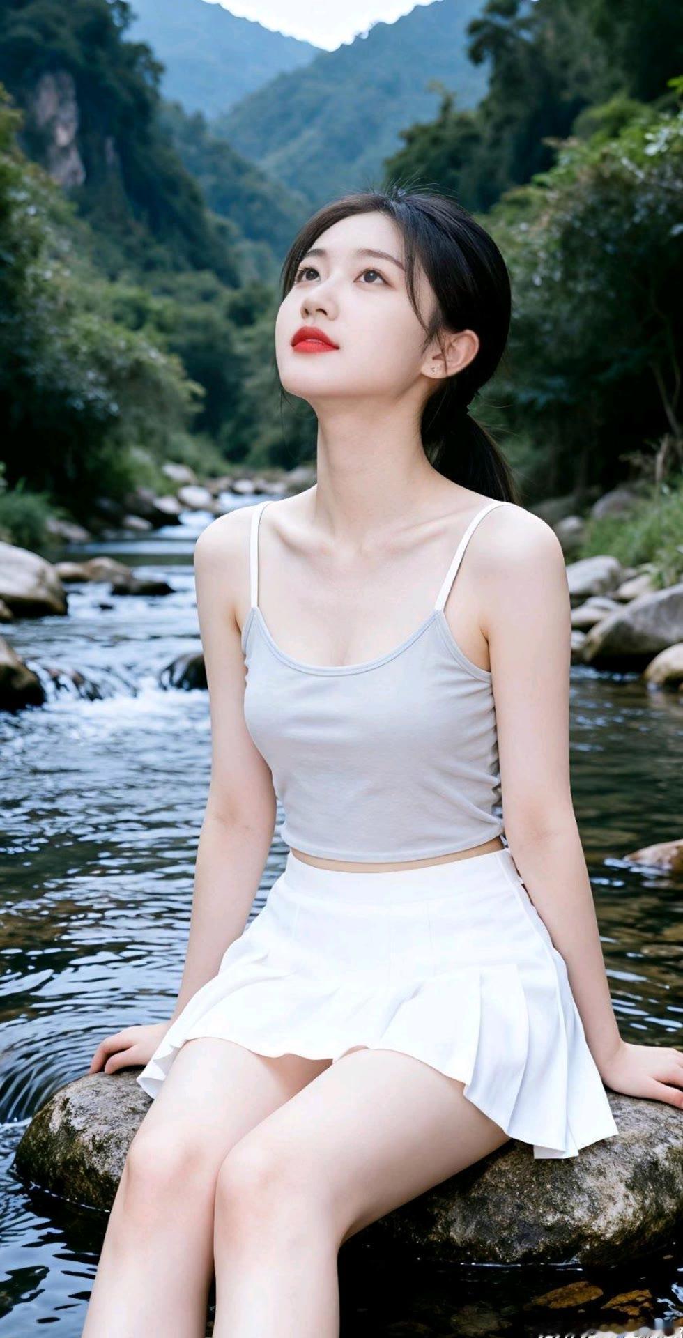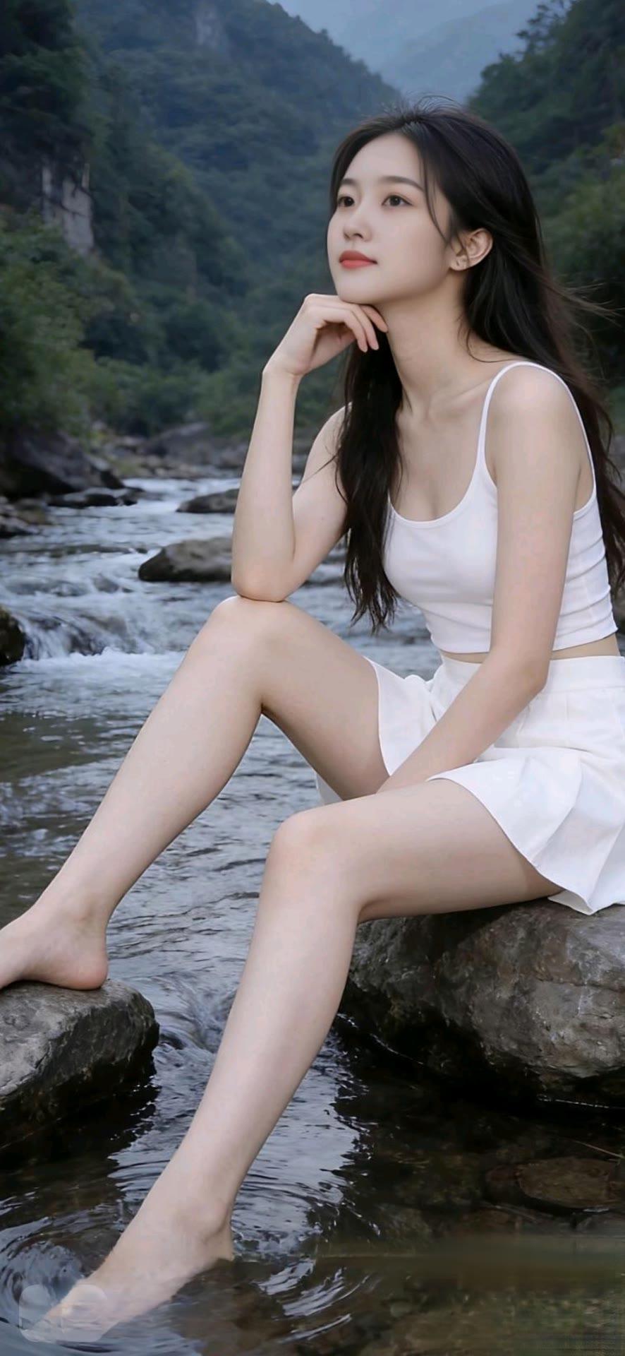 仙气飘飘的汉服少女,漫步在清澈的小溪边,宛如画中人。