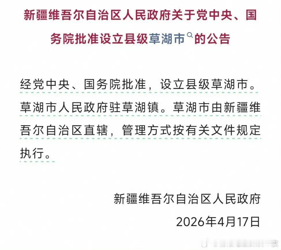【新疆新设草湖市 】草湖市是2026年4月17日(今日)经国务院批准新设立的新疆维吾尔自治区直辖县级市。该市由原兵团第三师四十一团草湖镇升格而来,是新疆在喀什地区布局的重要产城融合节点。草湖市