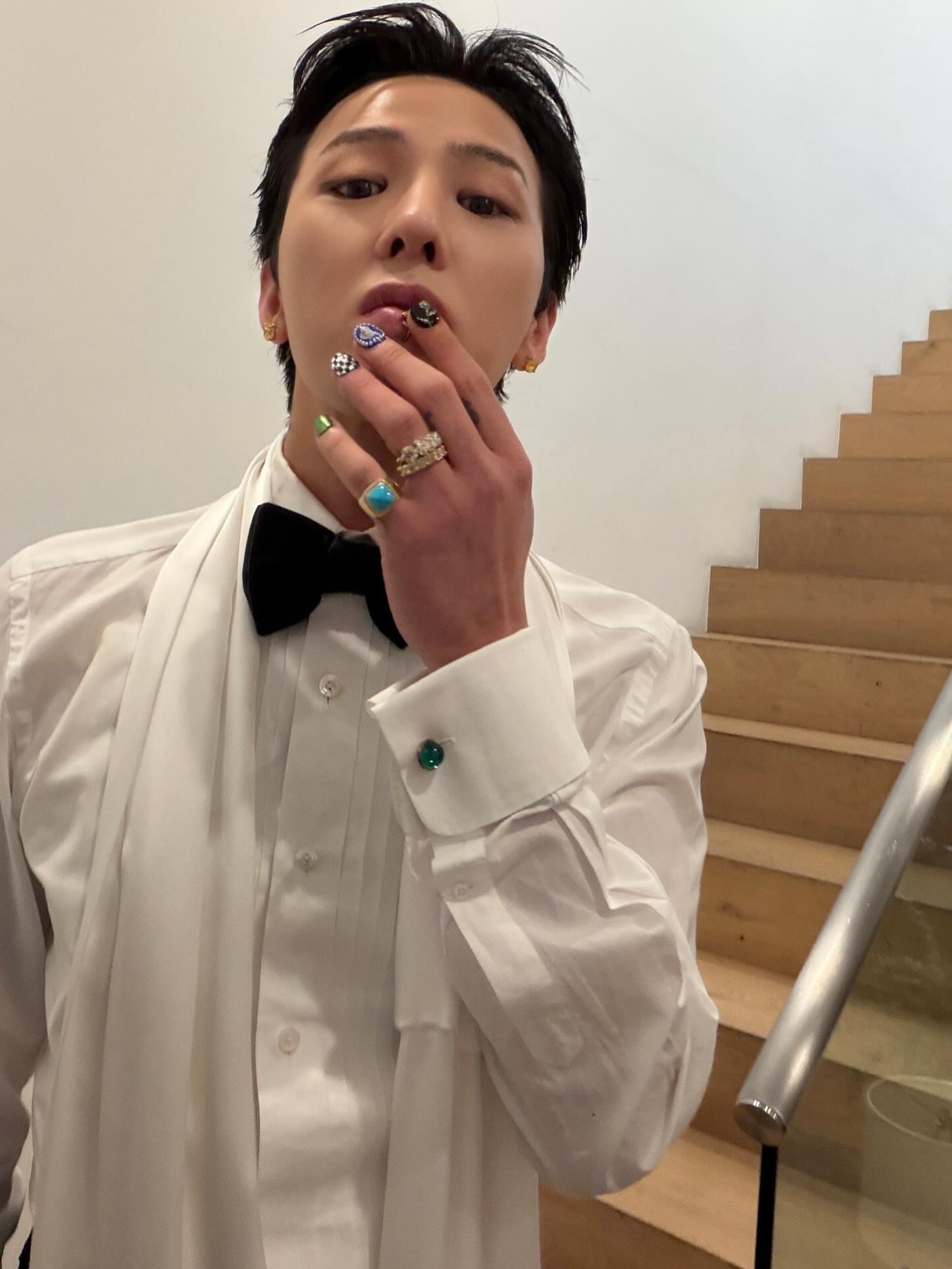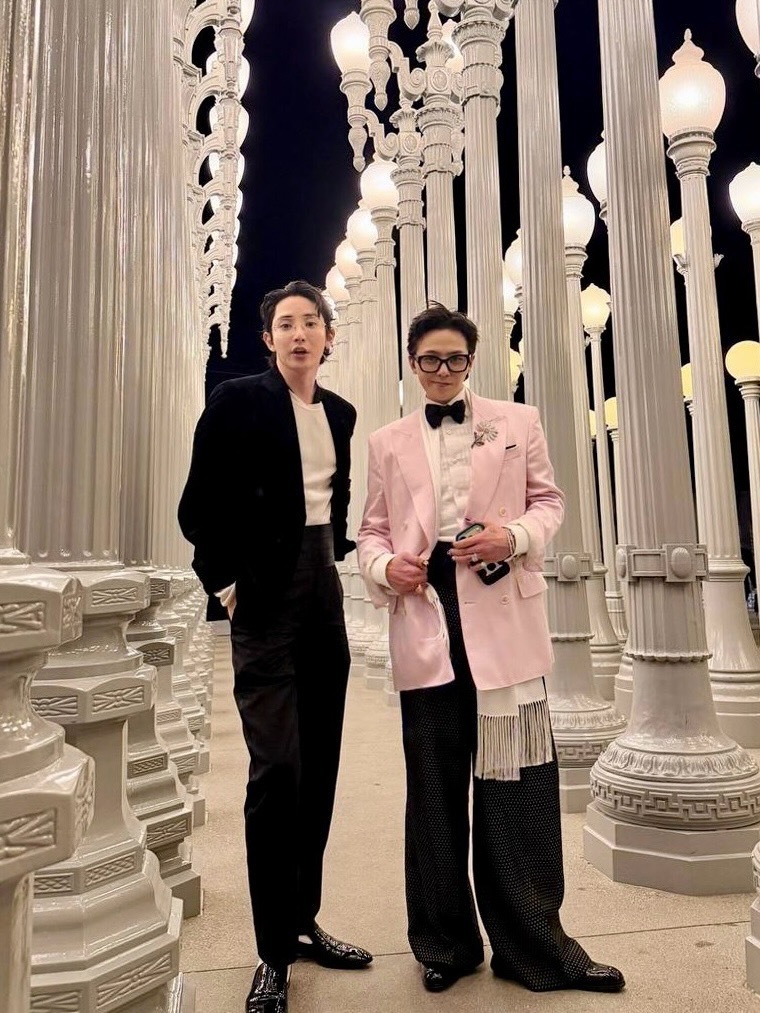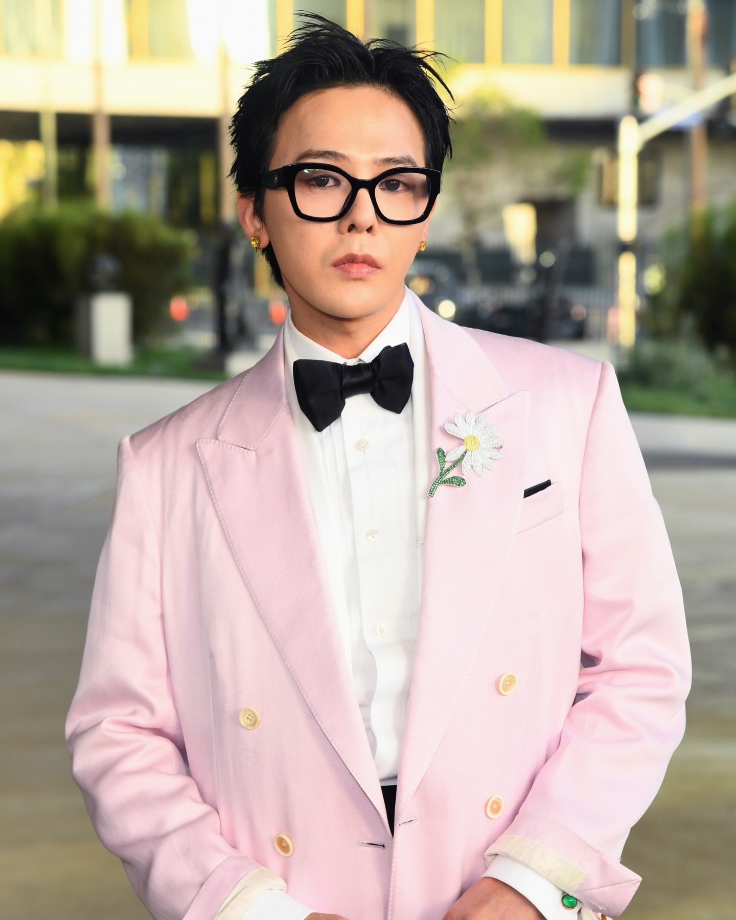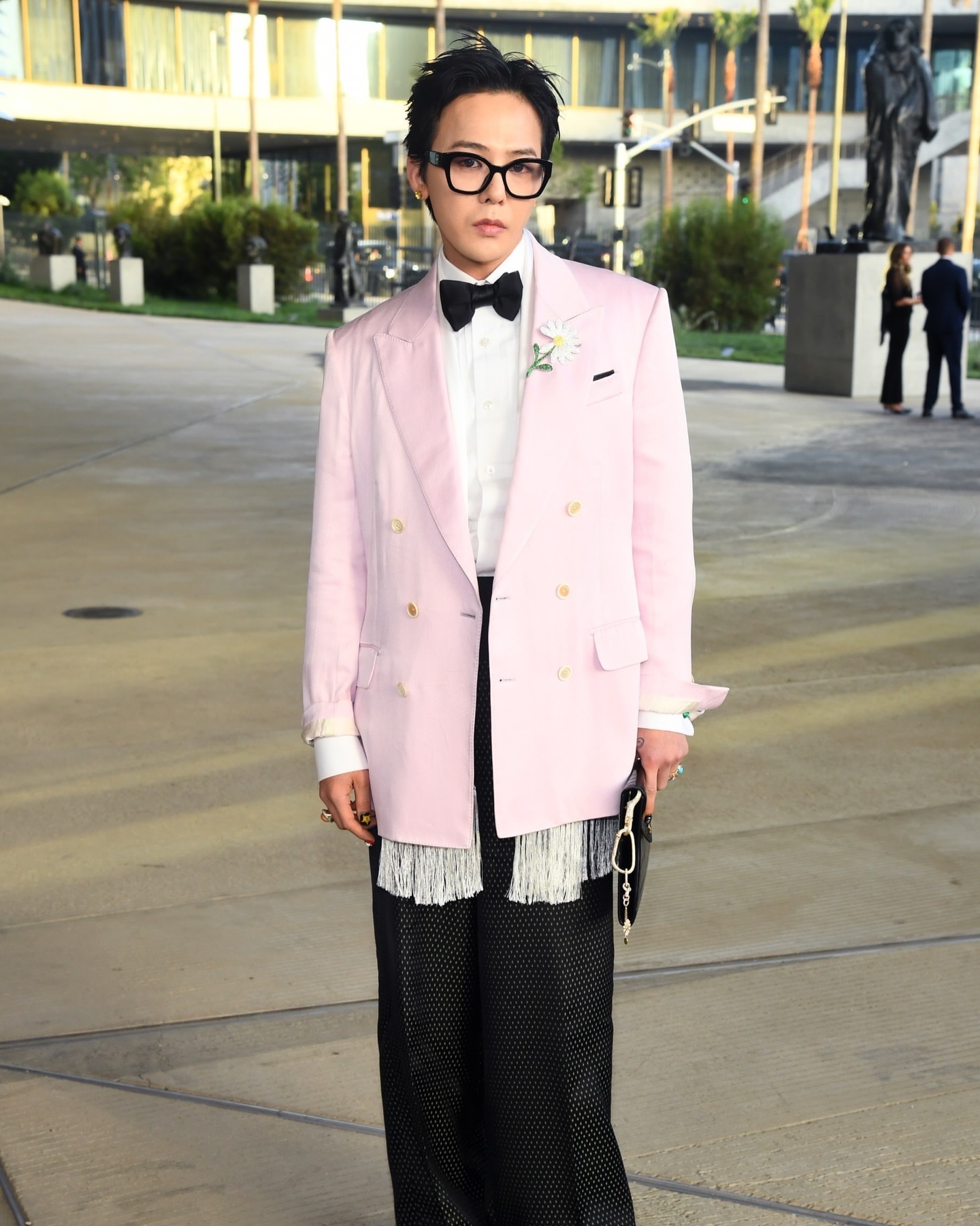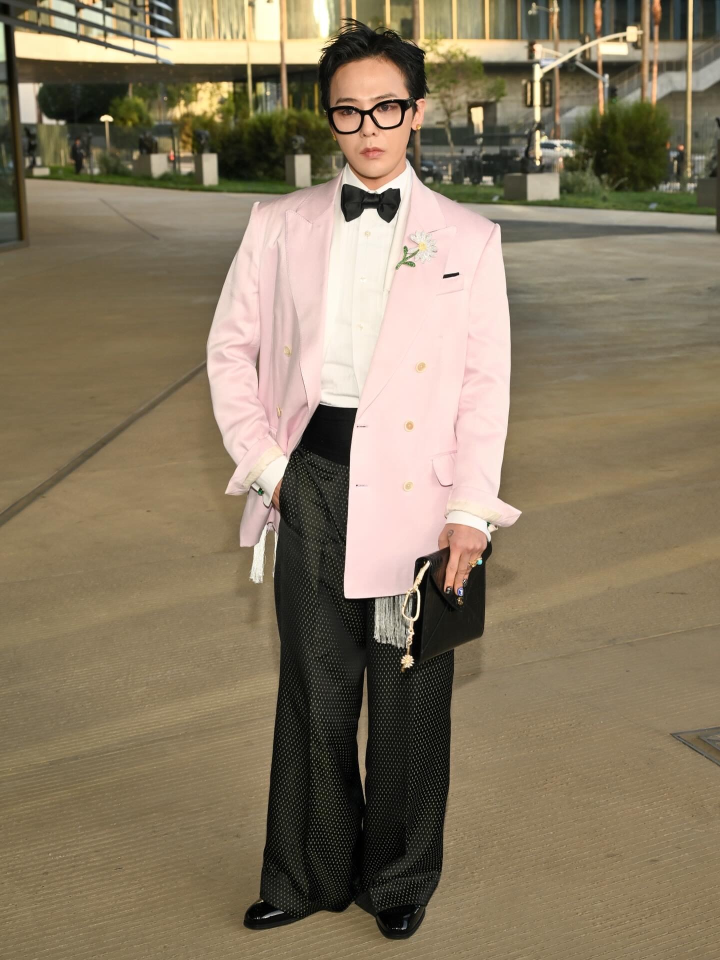 Lacma 洛杉矶郡立艺术博物馆「David Geffen Galleries」开馆晚宴星光熠熠!GD 权志龙穿了上粉下黑配色西装展现雅痞个性,胸前的招牌小雏菊钻石胸针与Chanel漆皮手拿包点亮细节!权志龙