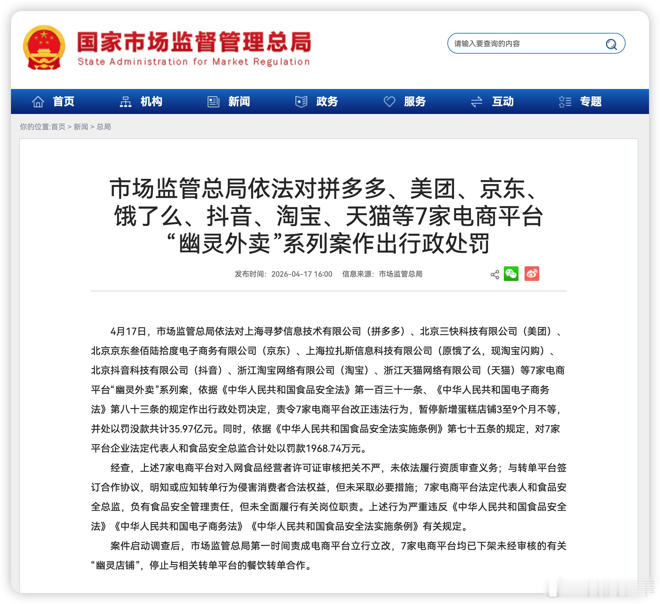 终于管这事了!刚看到新闻,市场监管总局刚罚了拼多多、美团、京东、饿了么、抖音、淘宝、天猫这7家平台35.97亿!因为“幽灵外卖”的事儿,这些平台审核不严,纵容假店铺,还和转单平台合作坑人。现在都要求整改,下架问题店铺,暂停新增蛋糕店。拼多多美团京东淘天抖音被罚35亿 7家电商平台已下架相关幽灵店铺 食品安全领域最大金额罚单