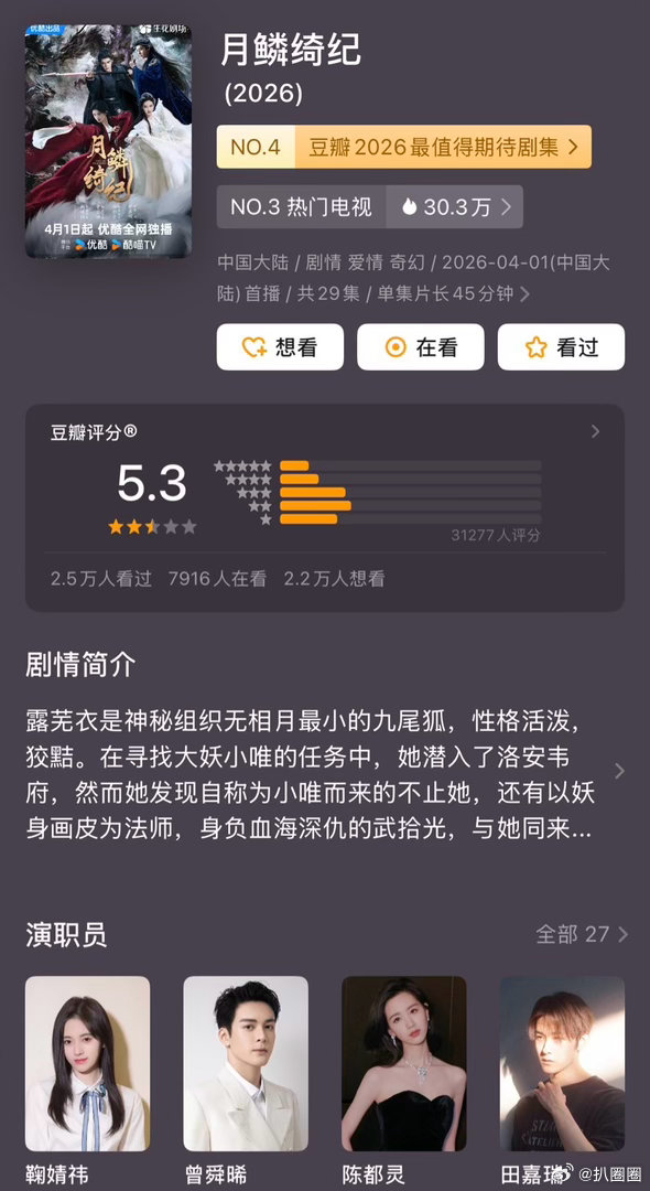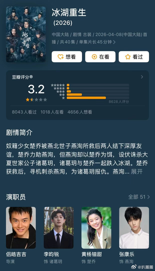 鞠婧祎田嘉瑞陈都灵曾舜晞《月鳞绮纪》开分5.3李昀锐黄杨钿甜《冰湖重生》开分3.2冰湖重生豆瓣3.2来说说两部评分高了低了~