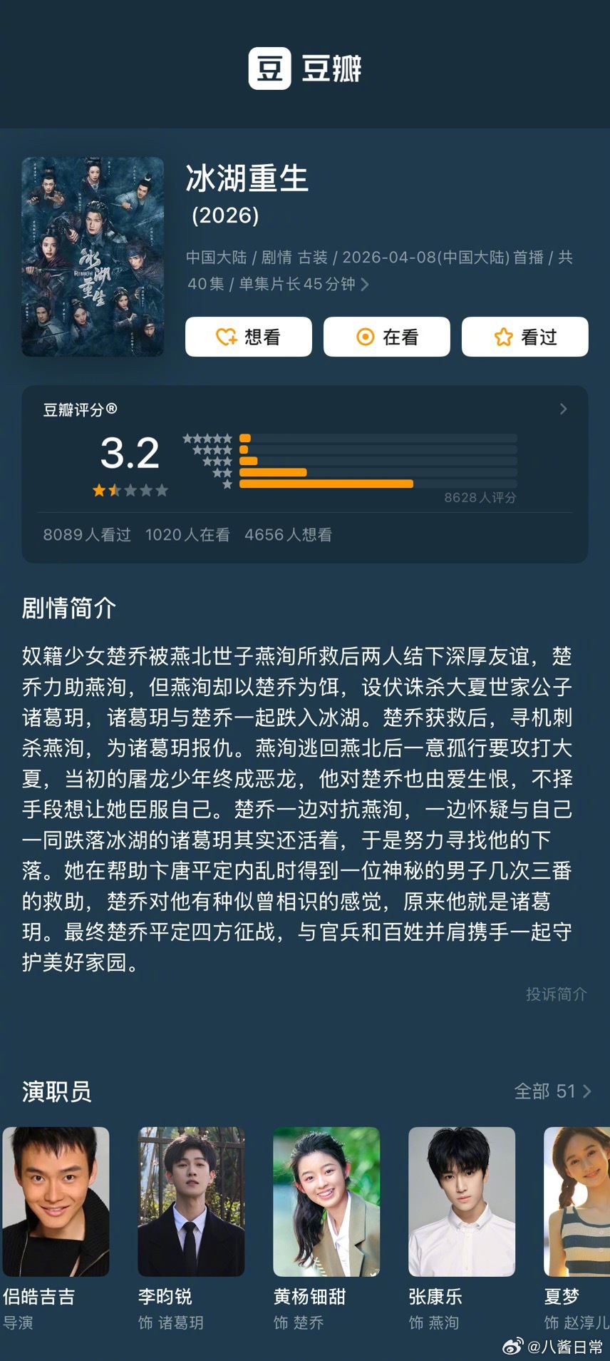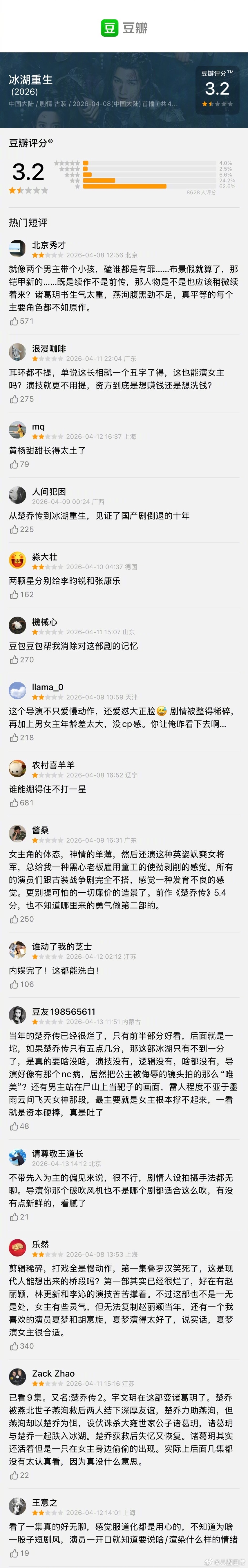 李昀锐、黄杨钿甜《冰湖重生》豆瓣开分3.2分冰湖重生豆瓣3.2