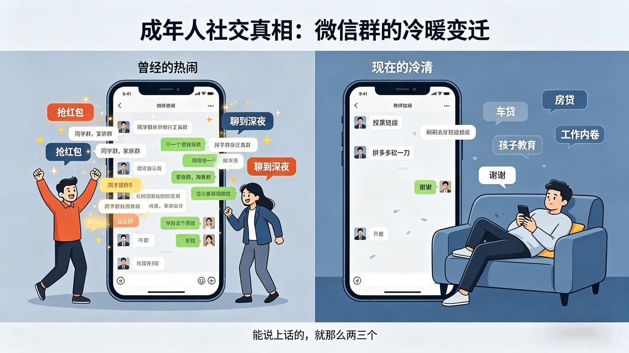 微信群里,曾经热闹得像菜市场。 同学群、家族群、同事群,刚建那会儿,一天几百条消息,抢红包能抢到手软,聊到深夜都不舍得睡。 现在呢?静得像坟场。 不是没人了,是没人说话了。 偶尔有人冒个泡,要么是投票链接,要么是拼多多砍一刀。发个红包都没人领,得等半天才有人回一句“谢谢”。 为什么? 因为大家都累了。 房贷车贷、孩子教育、工作内卷,光是活着就已经拼尽全力。下了班只想瘫在沙发上刷短视频,哪有精力去群里尬聊? 更扎心的是——群里的人,大多已经不是一个世界的人了。 同学群里,当官的不跟打工的聊,做生意的嫌上班的穷。家族群里,催婚催生的跟丁克族说不到一块去。至于同事群,离职那一刻就想退群,谁还稀罕知道前公司的破事? 现在群里仅存的“活人气息”,就是谁家老人走了,谁家孩子结婚了。像是一个公告栏,只传递“不得不通知”的信息。 这就是成年人的社交真相—— 不是不想维系,是真的没力气了。 以前觉得朋友越多越好,现在发现,能说上话的,就那么两三个。剩下的,都是“认识的人”,仅此而已。 你们也是这样吗?你的微信群里,还有人在聊天吗? 成年人社交真相