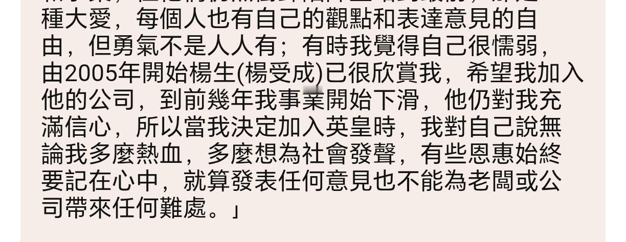 张敬轩2015年接受香港商台访问时,曾表示他签约了英皇之后,为了帮助他的英皇老板杨受成,会收敛一些。 所以,第一,他同情那些明确被封的艺人。第二,他不是不认同他们,而是害怕给老板惹上麻烦。现在2026年的道歉估计也是如此,是为了公司,而不是真的觉得错了。而且他2015之后也是有争议言论的。只不过频率降低了而已。 杨受成曾经在张敬轩经济有困难时帮助他,但是我觉得是亏本生意。