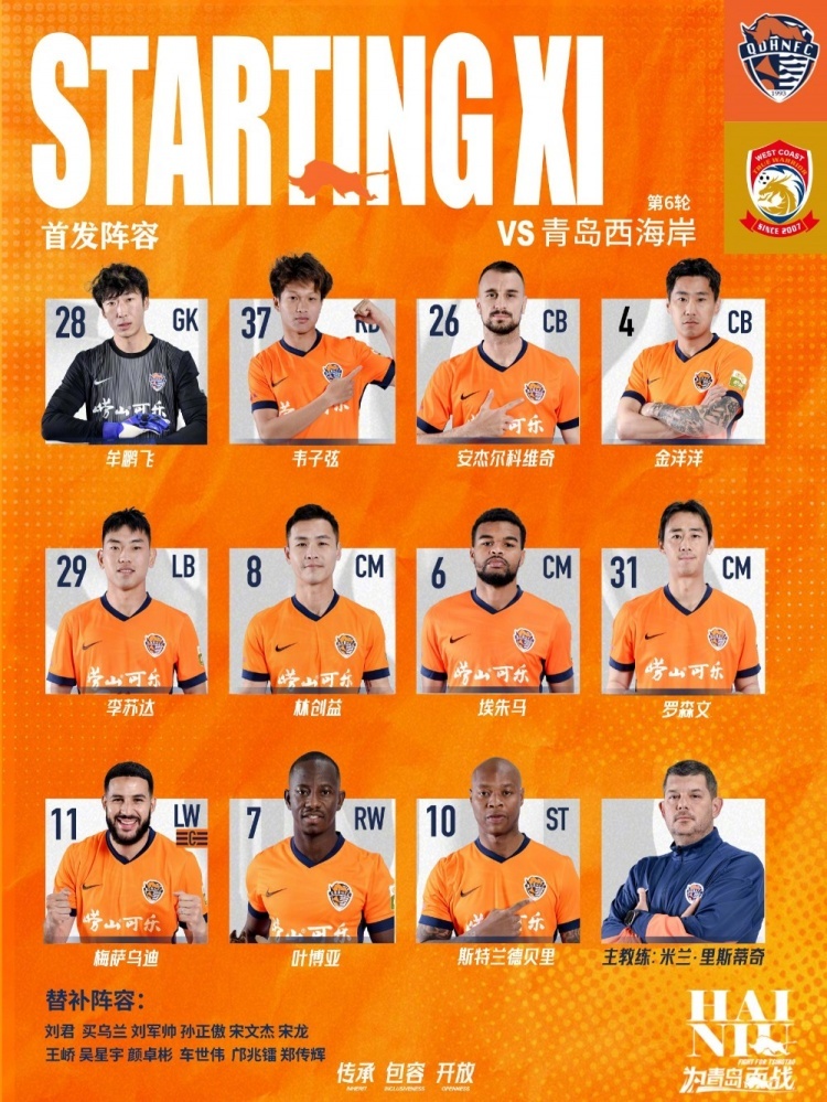 今晚19点中超第6轮青岛德比,青岛海牛vs青岛西海岸,赛前首发阵容公布。
