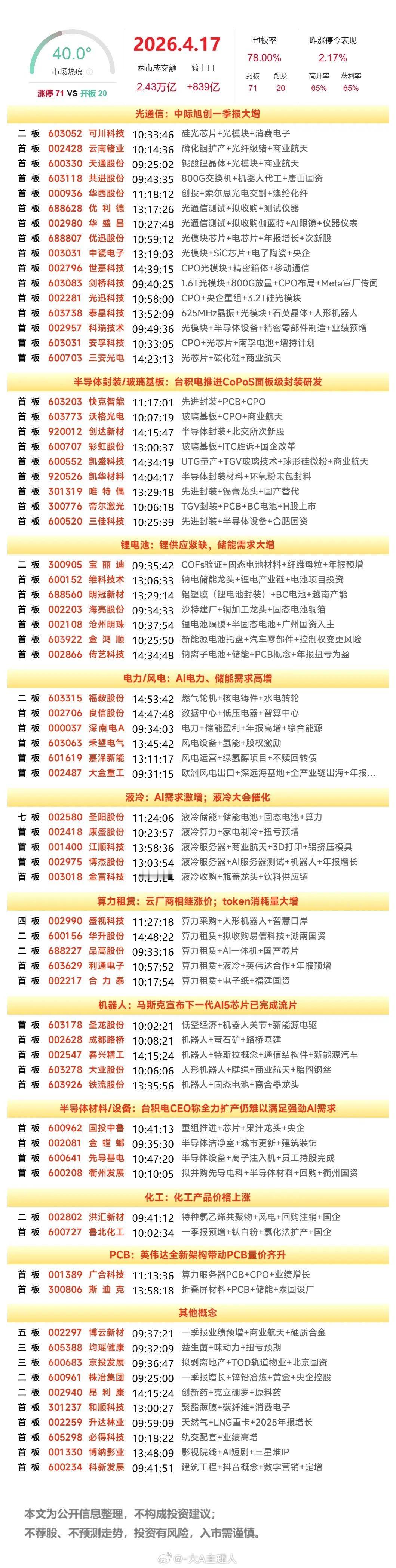 4月17日A股涨停复盘:算力硬件方向持续爆发