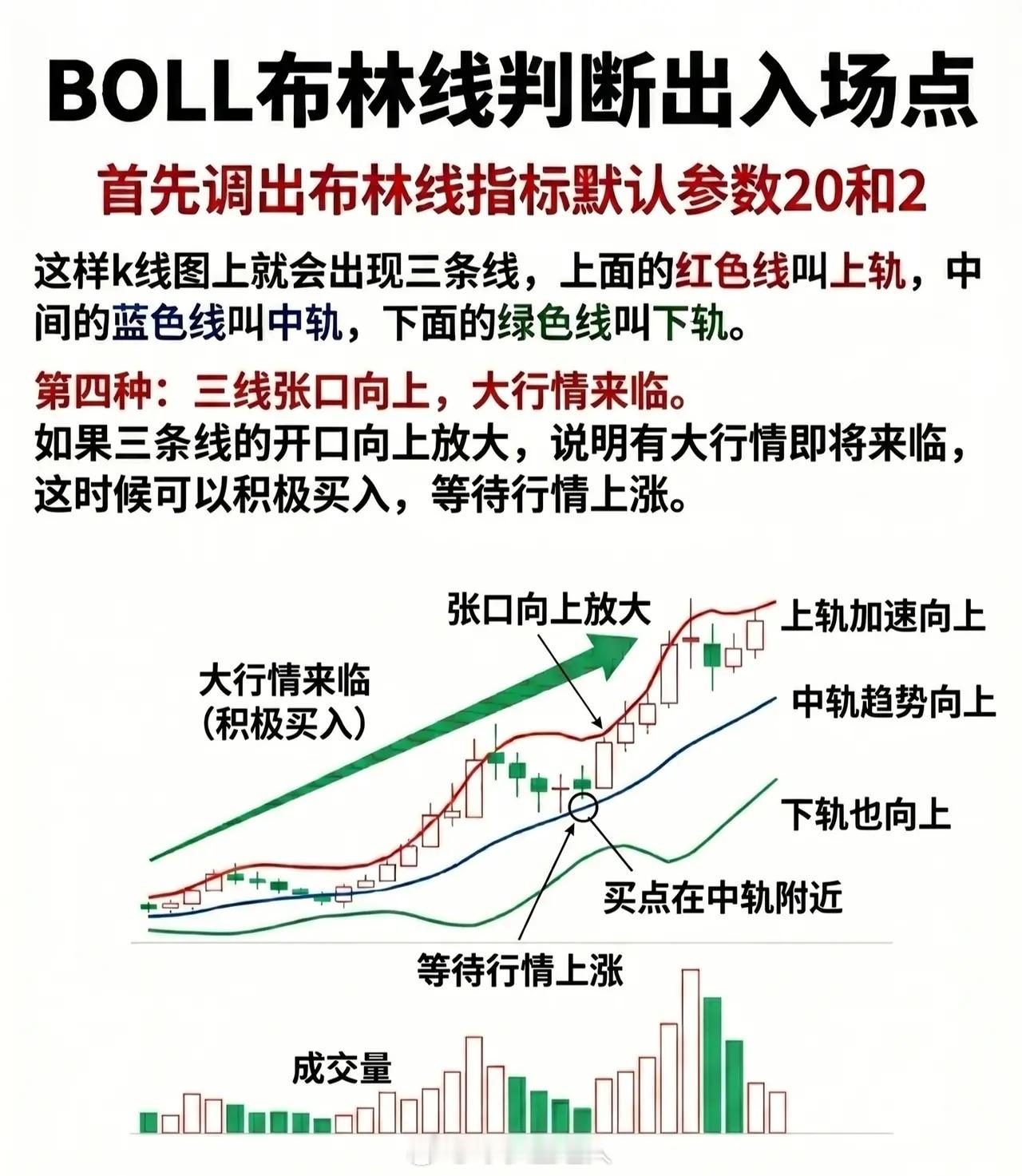 - 特征:上轨、中轨、下轨的开口(上下轨间距)向上放大,且中轨趋势向上,表明大级别上涨行情即将来临。- 策略:「积极买入,等待行情上涨」,买点参考中轨附近。开口放大+中轨向上,是趋势强化的信号(多头力量加速积累),此时介入有望捕捉主升浪。