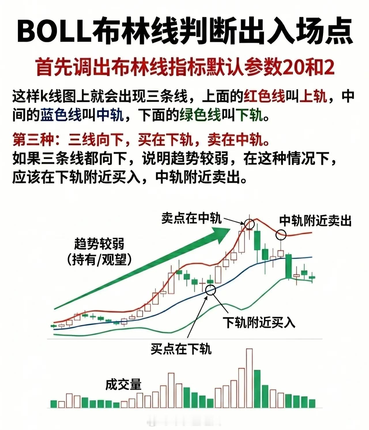 - 特征:上轨、中轨、下轨同步向下发散,表明市场呈弱势下行趋势。- 策略:「买在下轨,卖在中轨」,短线博弈反弹。弱势行情中,下轨是阶段性支撑(价格超跌后易反弹),但中轨是短期压力(反弹至中轨附近易再次回落),需快进快出。