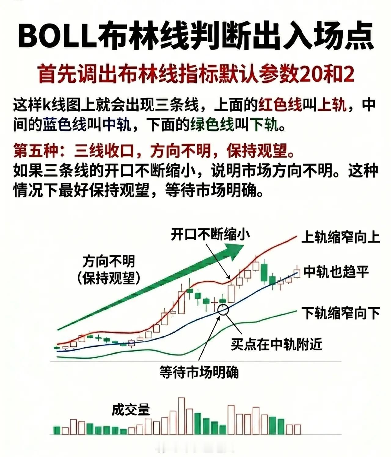 - 特征:上轨、中轨、下轨的开口持续缩小(上下轨间距收窄),说明市场方向模糊,多空博弈陷入胶着。- 策略:「保持观望」,等待市场明确趋势后再操作。收口阶段波动率低,交易胜率差,观望是更稳妥的选择。