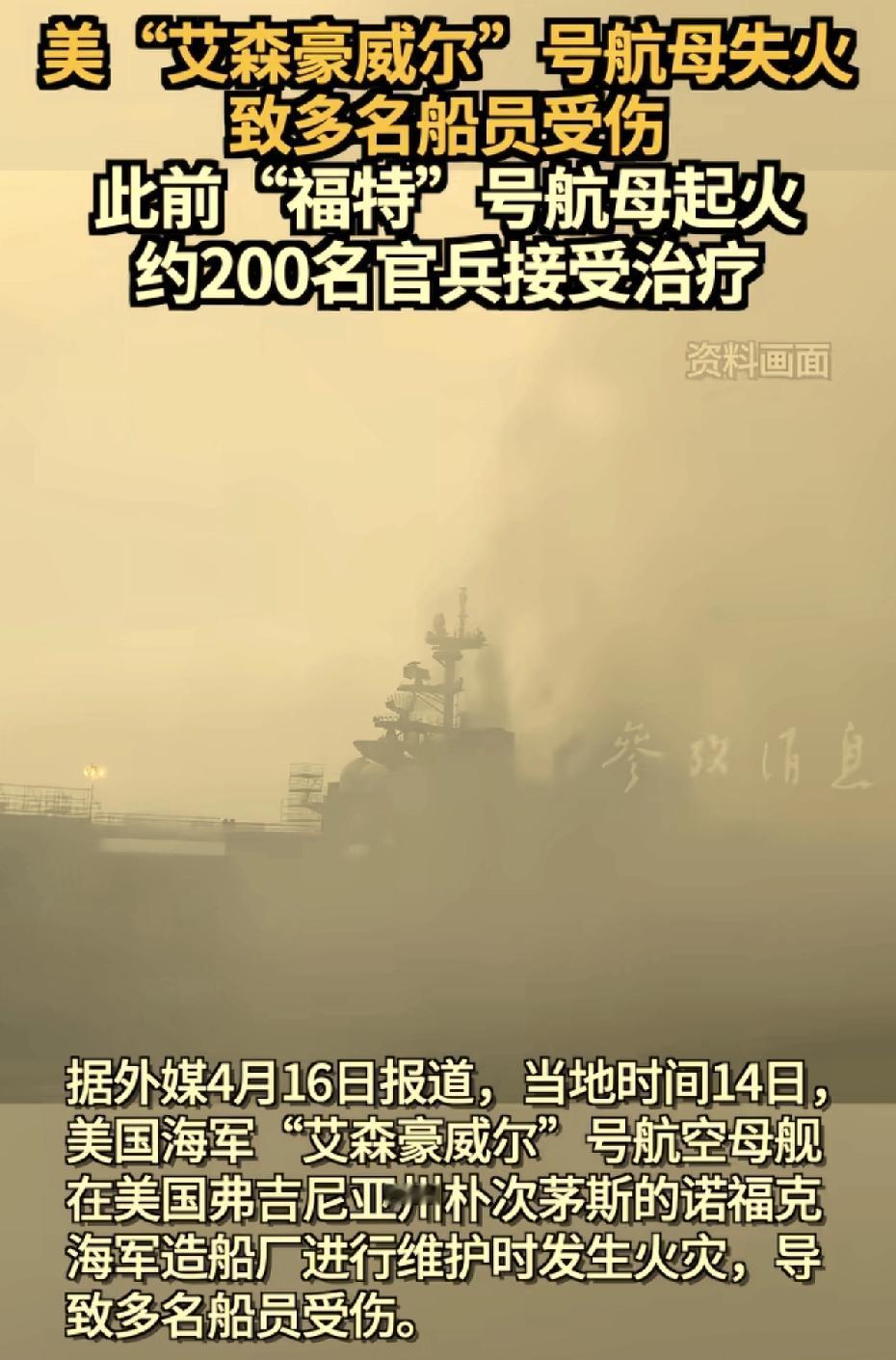 美国艾森豪威尔号航空母舰又起火了。 大家觉不觉得,美国现在像极了晚清时候的中国,武备松弛。 虽然说,人总是会犯错误的,但是同一件事情发生好几次,那就不是偶然。 当然啦,也不排除是因为美国和伊朗的两周停战时间快到了,艾森豪威尔号航空母舰的人不想去打仗?