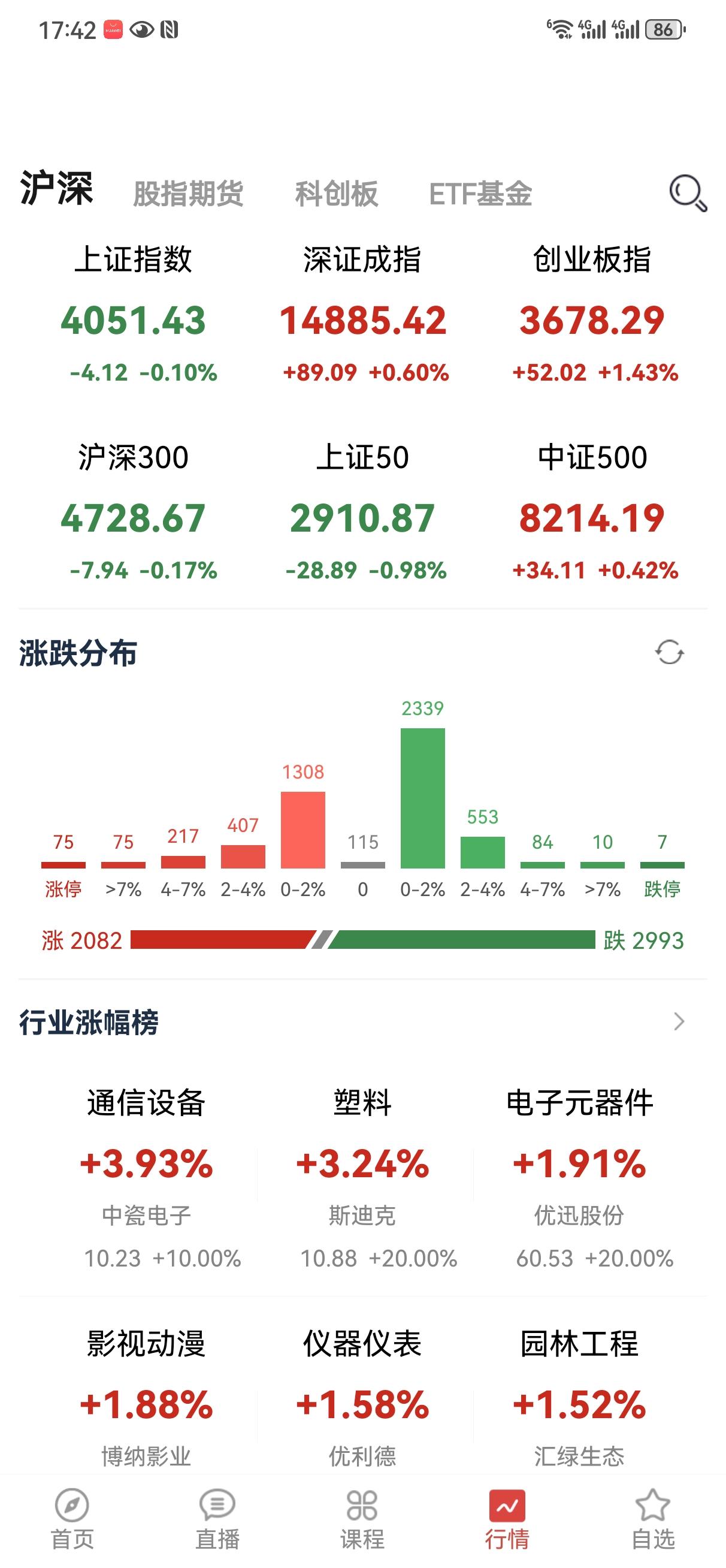 今天上证收了一根假阳线,真阴线,深证和创业板则是继续创出新高。资金还是在有限的板块里折腾,这就是昨天我说的中期行情的第一阶段,分化。涨的一直涨,不涨的反正也没有大跌,就是阴阳震荡,那些持有的不是在风口上的股票的朋友只能耐心等待,我并不建议去追高强势股,时机很难把握,弄不好就会两边打脸。对于大盘,我还是维持原来的判断,下周再说下周的事,周末愉快!