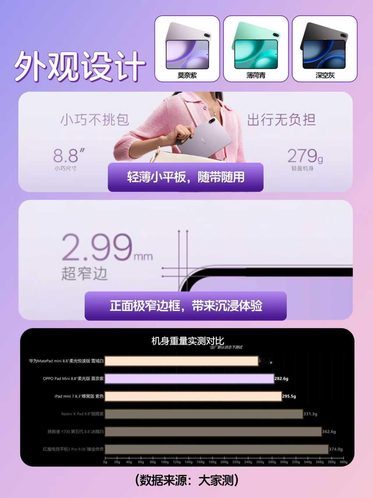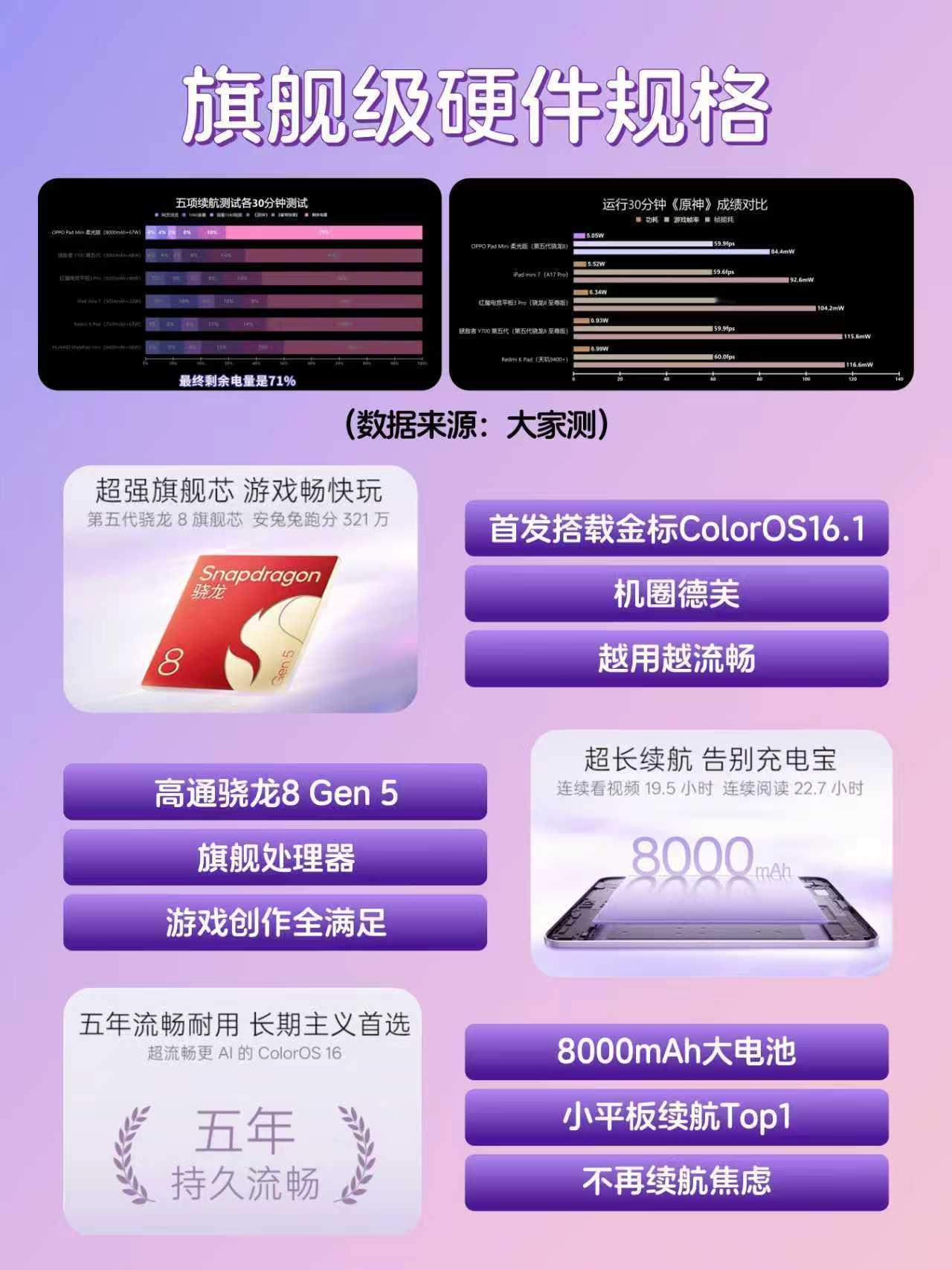 好纠结😭OPPO小平板这配置值不值? 最近真的想换个小平板了📱 通勤路上想看看书刷刷剧 手机屏幕太小眼睛受不了 笔记本又太沉懒得背出门 大平板塞不进小包包😓 纠结了好一阵子都没下手...... - 看了一圈小平板,终于等到OPPO Pad Mini解禁! 翻了好多UP主评测和官方配置,大家觉得咋样👇 🌟机身是真轻薄 279g、5.39mm厚,比旧平板轻太多 揣进小包无压力,单手举着刷剧久了也不累 🚀性能硬核 第五代骁龙8旗舰芯 看UP主测大型游戏都不卡,日常多任务切换顺滑到飞起 对于我来说完全够用了🤔 而且还有8000mAh大电池 通勤路上追剧应该完全👌 🖥️屏幕素质也不错 配备一块8.8英寸2.5K OLED屏 还支持144Hz高刷,画质不错、操作丝滑不拖影 屏幕还是超窄边,屏占比看着也很高 正面看着几乎全是屏幕! ✍️生产力拉满 看评测说这平板居然还支持PC级WPS和PC级剪映? 界面和操作和电脑端差不多 下班回家做ppt、剪视频都更方便 加上AI手写笔,效率必须嘎嘎提高吧? 👀感觉这OPPO Pad Mini完全不是“备用小平板” 而是能当主力用的全能小板子 通勤、出差、聚会带着都合适 性能、屏幕、续航、生产力全都要 🙋有没有已经试过的姐妹?实际用起来怎么样?值不值得冲? 数码爱好者OPPO Pad Mini