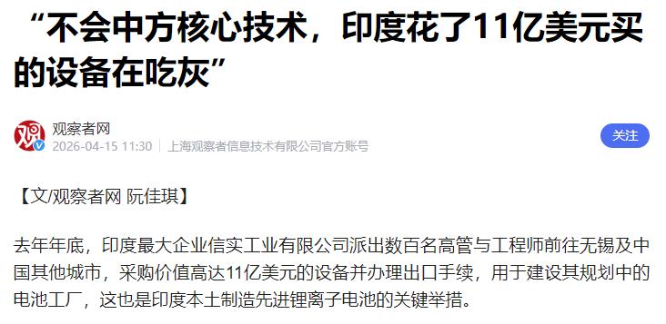印度这下彻底亏大了!豪掷11亿美元、折合近80亿人民币购入大批中国工业设备,费尽周折运回国内后完全无法投入使用,全程闲置堆放,连正常开机运行都做不到。 购买这批设备的,是印度首富穆克什·安巴尼旗下的信实工业——印度规模最大、实力最强的私营企业集团。去年年底,信实工业派出了数百名高管和工程师,浩浩荡荡奔赴中国无锡及其他多个城市,就是为了采购这套最先进的锂电池生产设备。 当时的信实工业可谓雄心勃勃。在莫迪政府"印度制造"战略的大力推动下,新能源和电动汽车被视为印度未来经济增长的核心引擎,而锂电池则是整个产业链的"心脏"。谁能率先建立起本土的锂电池产能,谁就能在印度未来的能源革命中占据主导地位。 信实工业原本计划用这批设备,在古吉拉特邦打造一座世界级的超级电池工厂,目标是实现磷酸铁锂电池的本土化生产。 为了确保万无一失,他们不仅花了大价钱买设备,还特意催促中方供应商和监管机构加快生产和清关流程,恨不得立刻把整条生产线搬回印度。 然而,就在这批设备漂洋过海抵达印度的同时,中国出台了一项关键政策调整。 2025年7月,中国商务部会同科技部更新了《中国禁止出口限制出口技术目录》,将电池正极材料制备技术,包括磷酸铁锂、磷酸锰铁锂等核心制备技术,正式列入了限制类出口目录。 这一调整直接给信实工业的宏伟计划按下了暂停键。信实原本已经和中国企业谈好了技术授权合作,但随着中国出口管制政策的收紧,相关的技术转让审批程序变得更加严格,最终信实工业没能拿到他们最需要的核心技术许可。 很多人可能会问,设备都买回来了,为什么不能自己研究着用? 答案很简单:锂电池制造并不简单,它是一个极其精密复杂的系统工程,绝不是把原料倒进机器就能出成品那么简单。 从正极材料的精确配比、电解液的独家配方,到涂布工艺的温度控制、化成分容的参数设定,整个生产过程涉及上百道工序,每一个环节都有经过十几年甚至几十年积累的核心工艺诀窍。 这些东西不在设备说明书里,也不在机器的硬件里,而是深深烙印在中国工程师的脑子里。 信实工业的技术人员也曾尝试自己调试设备,但结果一败涂地。哪怕只是电极浆料里多放了0.1%的添加剂,或者涂布厚度差了几微米,生产出来的电池要么性能不达标,要么直接就是废品。 没有中国技术人员的现场指导和调试,这些价值80亿人民币的先进设备,就真的变成了一堆不会动的"铁疙瘩"。 更尴尬的是,这并非个例。印度钢铁巨头金达尔集团也曾计划与中国企业合作建设50吉瓦时的电池工厂,同样因为无法获得核心技术授权,项目至今陷入停滞。 数据最能说明问题,《电池纪事》的创始人克里斯托弗·奇科直言,印度号称正在建设178吉瓦时的电池产能,但实际上已经投产并实现商业化生产的电池芯产能,只有区区1吉瓦时,连目标的1%都不到。 目前印度市场上销售的电动汽车,超过90%的电池芯仍然依赖从中国进口。 印度政府为了扶持本土电池产业,已经投入了数百亿美元的补贴和政策支持,但结果却是对中国供应链的依赖程度反而越来越深。 2024年,印度从中国进口的电池相关产品总额超过30亿美元,比五年前增长了2.5倍。 这次信实工业的惨痛教训,给所有急功近利想要"弯道超车"的国家上了生动的一课。核心技术是买不来、换不来的,它需要长期的投入、耐心的积累和无数工程师的默默奉献。 印度只看到了中国锂电池产业今天的辉煌,却没有看到我们背后十几年如一日的艰苦攻关。 如今,那11亿美元的设备还在印度的仓库里积灰,而信实工业除了发表一份"计划没有变化"的官方声明外,也拿不出任何有效的解决方案。 这场耗资巨大的"印度制造"实验,最终以这样一种尴尬的方式收场,实在令人唏嘘。
