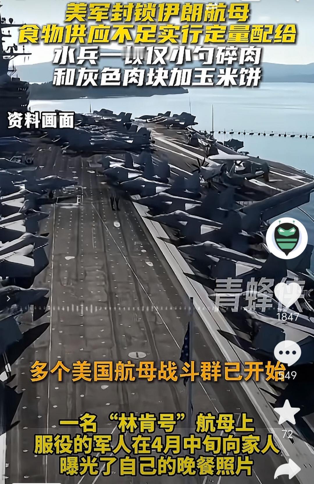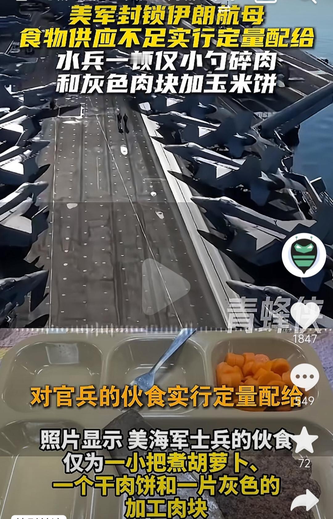 美国航母出现粮食不足的情况,据一名在航母的士兵透露,他们现在每餐只能吃一些碎肉,胡萝卜,大饼,再没有其他的菜品可以供应。想不到美国这后勤工作这样的没有保障,这是想让美军空着肚子上战场吗?让人难以置信的是,这还是在美国的航母上。这也能充分说明美国这些指挥人员的水平究竟是有多么的菜,连后勤都无法保障,更像是临时被推上战场的,什么准备都没做好呢一切都显得匆匆忙忙。我们常说兵马未动,粮草先行,美国怎么就没做到呢?他们不是说他们很有作战经验吗,而且这还是在停战阶段,难道都没有时间无法补给吗?