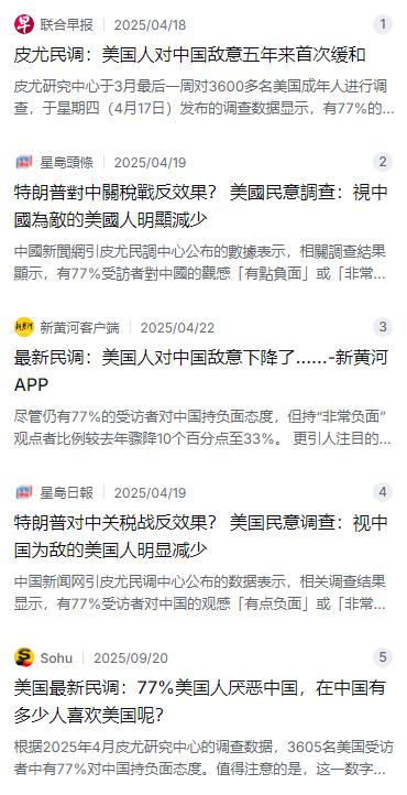 美国民调称77%民众反感中国,中国民众对美好感度呢?结果让白宫沉默。皮尤报告显示,7成美国人不喜欢中国,有3成人甚至把中国看作敌人。而这一切,正随着新年那一场“洋悟运动”,开始出现微妙变化。 麻烦看官老爷们右上角点击一下“关注”,方便您进行讨论和分享,感谢您的支持! 2025年4月,美国皮尤研究中心扔出了一份让不少人议论纷纷的民调报告。调查显示,77%的美国受访者对中国持负面看法,但比2024年的81%下降了4个百分点,这是五年来头一回出现明显回落。更值得注意的是,其中持“非常负面”看法的比例从43%直接降到33%,认为中国是“美国敌人”的受访者也从去年的42%降到了33%。与此同时,认为中国是美国最大威胁的人,从2023年的50%降到了42%。 这份民调是2025年3月24日至30日进行的,共有3605名美国成年人参与调查,正好赶上美国对华加征关税的节骨眼上。按理说贸易摩擦正打得热闹,民间情绪应该更对立才对,结果反而出现了缓和迹象,连彭博社都说这“相当令人意外”。 仔细扒一扒数据就能发现,这种缓和在不同年龄段之间差别很大。65岁以上的美国人里,有47%把中国当敌人,50到64岁的占40%,可到了18到29岁的年轻人群体里,这个比例就只剩下19%了。越年轻的美国人,对中国持极端负面看法的比例就越低——30岁以下只有21%,30到49岁是27%,50到64岁就涨到37%了。看来年轻人和老一辈之间的认知差距还真不小。 那中国这边是什么情况呢?根据清华大学国际安全与战略研究中心发布的《中国民众对国际安全的看法》年度报告,中国民众对美国的评分在五分制下达到了2.38分,比2024年的1.85分有明显提升,也是这份报告从2023年开始发布以来的最高分。这个提升幅度确实不小,从“不及格”到接近“中等”,说明中国民众对美国的看法也在发生微妙变化。 但千万别误会,2.38分在五分制里还算不上“喜欢”。另一项由芝加哥全球事务委员会和卡特中心联合进行的调查显示,只有17%的中国受访者认为美国是中国的朋友,83%持相反观点。大多数中国老百姓对美国的态度,说白了就是“不指望太多,但也没那么极端反感”,用一句话概括就是务实理性。数据显示,61%的中国受访者支持对美双轨策略——保持必要合作的同时,也得适当限制美国影响力。 两边的情况一对比就清楚了:美国那边虽然有77%的人对中国不感冒,但数字已经在往下走了,尤其年轻人越来越不受那些极端言论的影响;中国这边对美国的观感在回暖,但总体还是偏谨慎,谈不上多热乎。这种双向微调的趋势,跟过去几年那种一边倒的对立情绪比起来,已经是个不小的变化了。 那么问题来了,到底是什么原因让美国人对华态度开始缓和?除了关税战带来的经济阵痛——调查显示52%的美国人认为加征关税对美国有害,一个典型美国家庭每年要多支出上千美元——还有一个被不少人忽略的因素:民间交流正在悄悄打破信息壁垒。 2026年新年伊始,一场被网友戏称为“洋悟运动”的网络大迁徙在美国年轻人中间突然爆发。起因是美国最高法院裁定支持TikTok“不卖就禁”的法律,按照要求,字节跳动必须在2026年1月19日前出售TikTok的美国业务,否则该应用将被禁用。这条法律影响到全美超过1.7亿TikTok用户。 面对禁令,大量美国年轻用户没有坐以待毙。他们开始寻找替代平台,最终把目光投向了中国社交应用小红书。从2026年1月13日起,数以百万计自称为“TikTok难民”的美国用户涌入小红书,使其一度登顶美区苹果应用商店下载榜。到1月19日,小红书已经在43个国家的App Store免费应用下载榜上排名第一。在小红书上,tiktokrefugee 话题的浏览量迅速超过2500万次。 这些美国用户涌入小红书后,发现这里跟他们在美国媒体上看到的中国完全不一样。没有那些被反复渲染的对抗叙事,取而代之的是中国普通人分享的日常生活——从火锅怎么吃才正宗,到国内高铁到底有多方便;从《哪吒》系列电影,到各地美食美景。一位名叫约瑟夫·诺布尔的美国创作者告诉媒体,他来到小红书后学到了很多关于中国电影、习俗和生活方式的知识,还特意去影院看了《哪吒之魔童闹海》。用他自己的话说,“中国社交平台上的文化自豪感与互助精神,在其他社交平台实属罕见”。 这样一来,美国媒体长期建构的那个关于中国的刻板印象,直接被大量真实的日常生活内容冲散了。许多美国年轻人第一次意识到,原来真实的中国跟媒体报道的“那个中国”之间,差了十万八千里。这种认知上的“顿悟”,恰恰是“洋悟运动”这个名字的由来——不是靠说教,不是靠宣传,就是靠最朴素的信息接触,让隔阂自然消解。