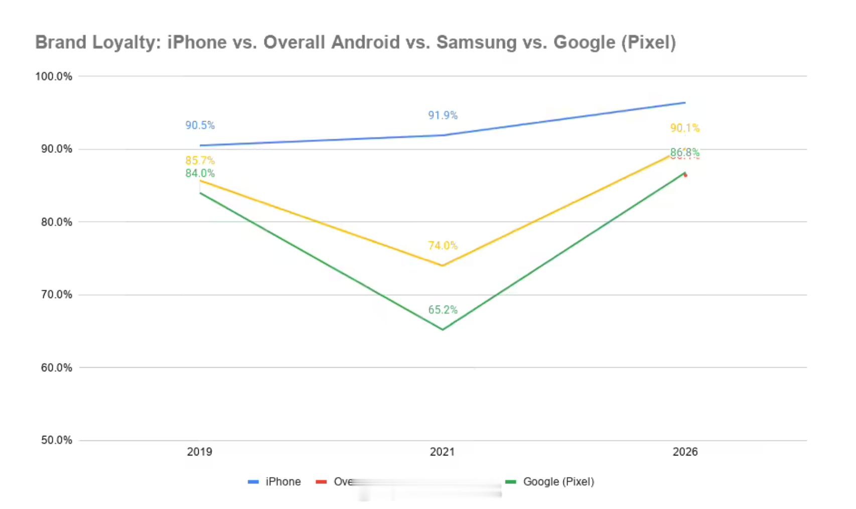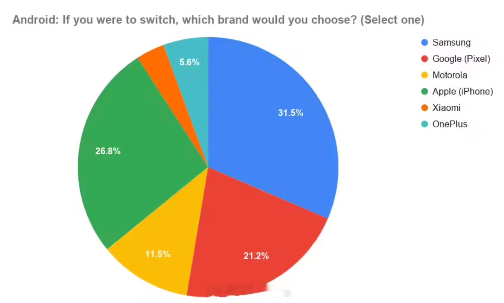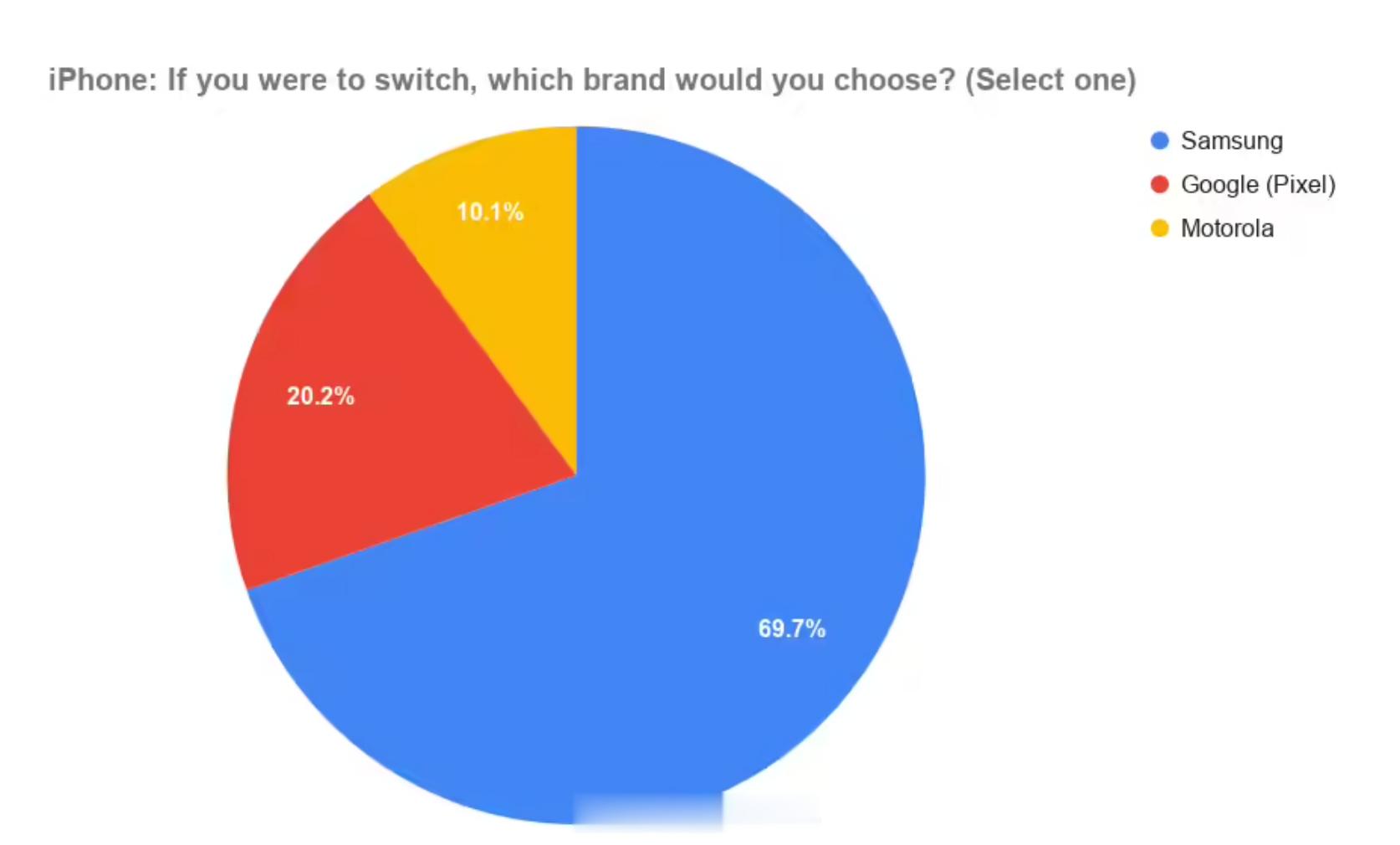 安卓整体忠诚度为 86.4%,13.6% 计划转平台。想换平台的 3.6% 的 iPhone 用户里,近 7 成首选三星、2 成选谷歌,毕竟美国手机市场可选品牌没国内这么百花齐放。