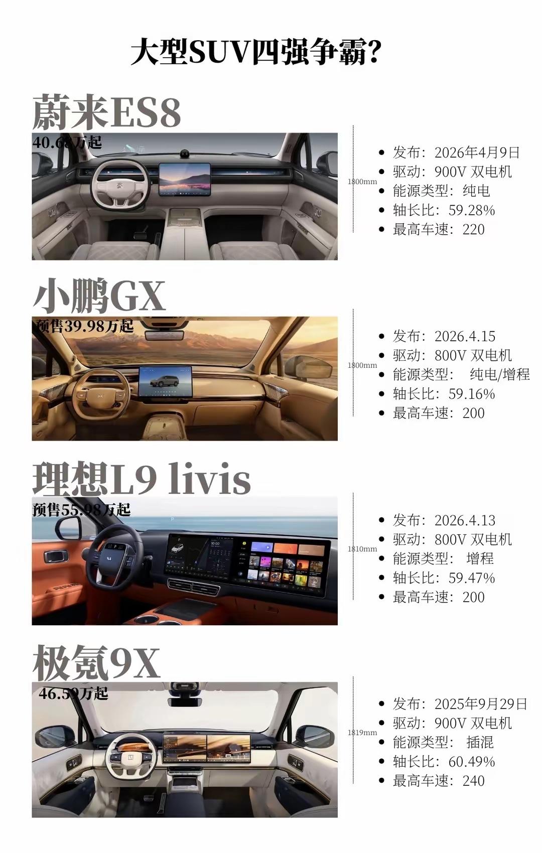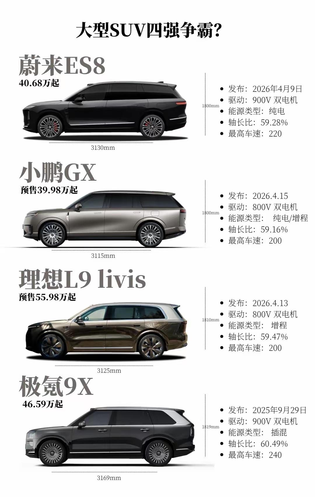 新势力旗舰SUV“天王山之战,蔚来双旗舰出战。 蔚来ES9: 王者 极氪9X: 至尊 蔚来ES8:钻石 问界M9:铂金 理想Livis:黄金 小鹏GX:白银