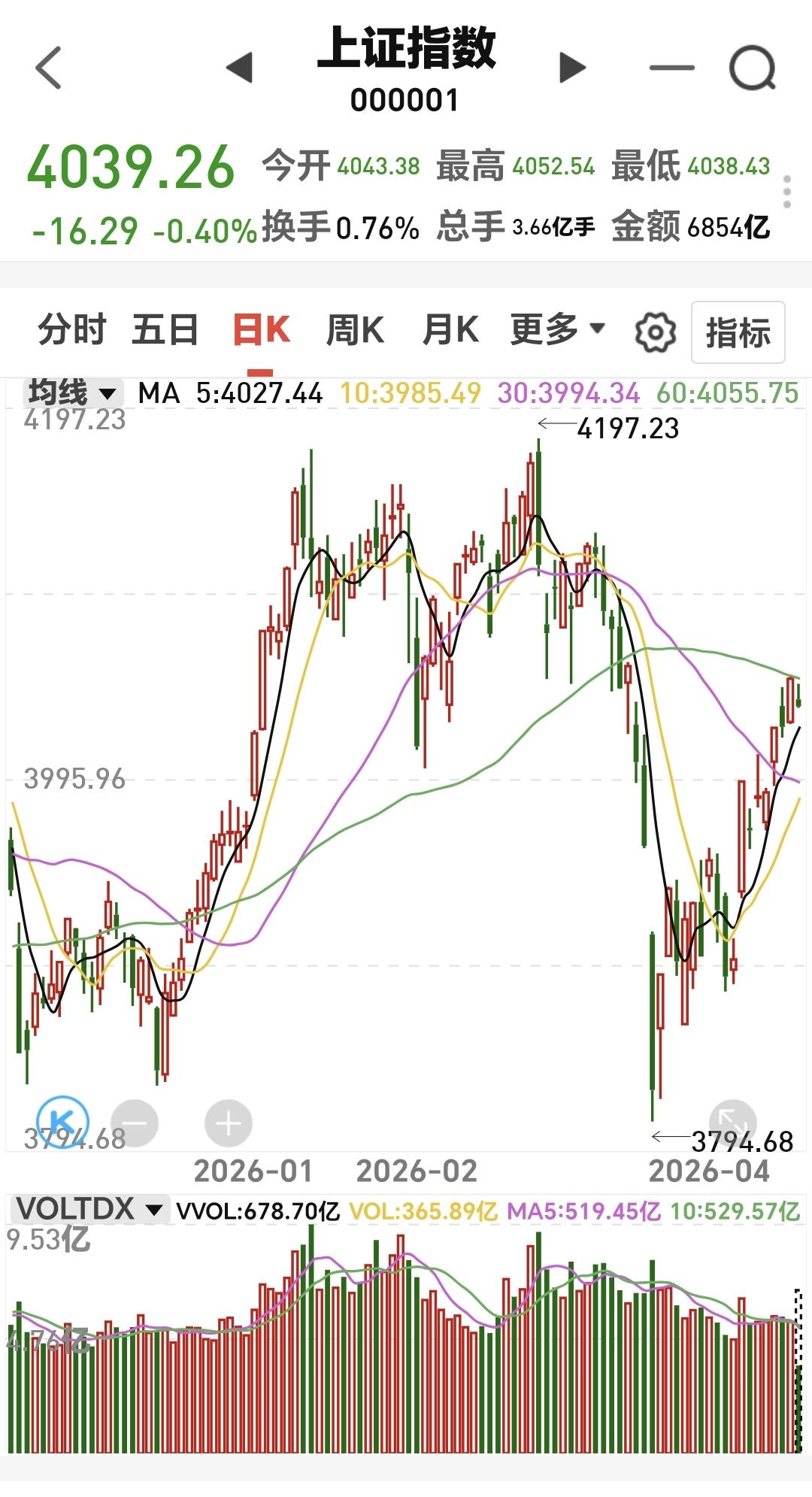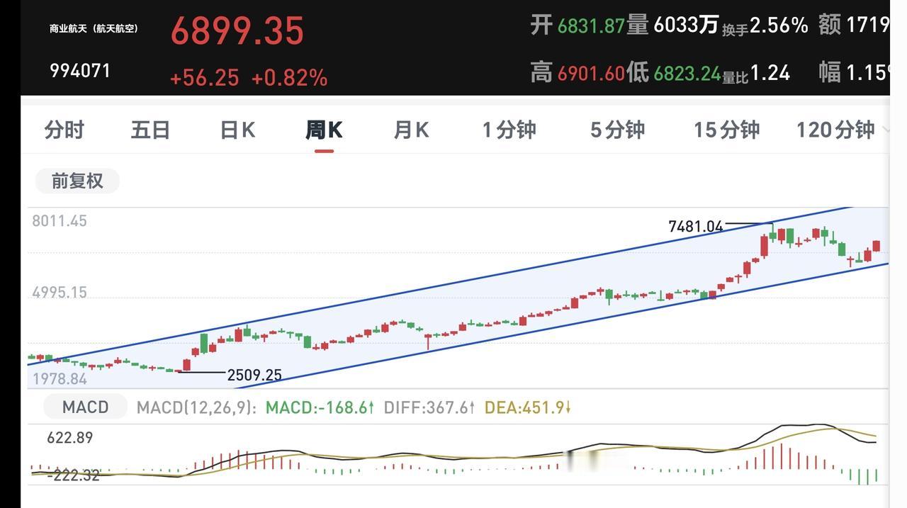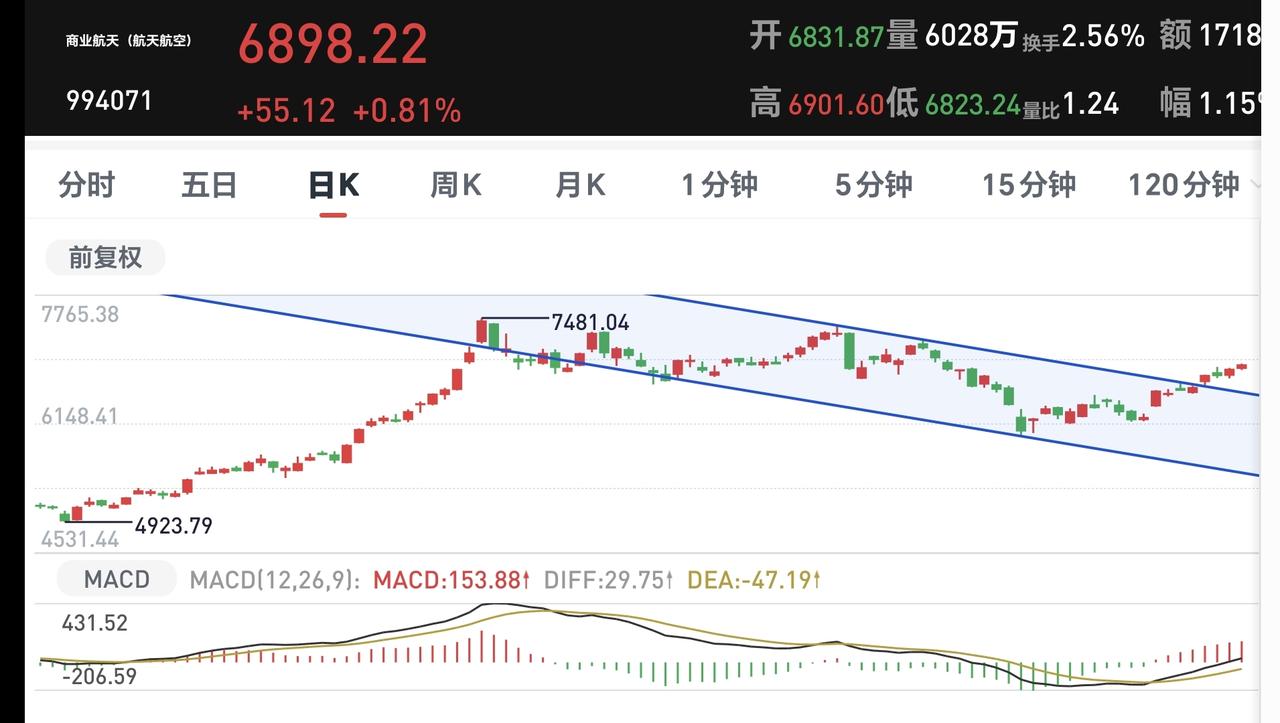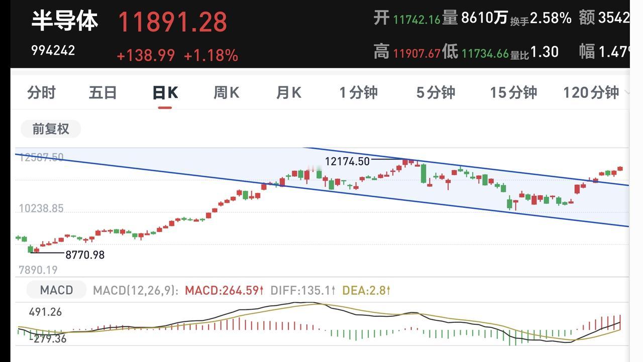 基金:半导体板块和商业航天板块究竟应该怎么办 下午开盘以后,指数还是小幅度震荡,震荡的幅度还是在上午的高点与低点之间,震荡的幅度还没有加大,但肯定不可能下午还是这样的幅度,震荡的幅度加大是必然的,创业板指上涨了0.59%,盘中点位3647点,上证指数下跌了0.37%,盘中点位4040点。 黄色线还是在蓝色线的上方,两条线之间的敞口还是不大,五天线位置是4027点,如果加大幅度的时候,方向是选择向下,需要观察4027点的得失,只要保持在这个点位之上,就不能说明市场已经走坏,相反,在收盘的时候很有可能收上去,如果跌破了4027点,那今天收上去的难度就有点大,因为我观察到有资金在出逃。 半导体板块基金现在盘中估值上涨了0.47%,是连续第二个交易日上涨,持有人数在所有板块当中排名第九位。 半导体板块星期一的时候上涨突破了日线级别下跌通道的上轨线,然后是持续上涨,现在是已经处于有效突破当中,持有的人可以继续持有,想进场的人,在突破的时候就应该考虑可不可以进场。 半导体板块周线级别处于上涨通道中,这个板块处于周线级别上涨趋势中,只要这样的上涨趋势不被改变,长线持有的人都可以继续持有。 商业航天板块今天也是上涨,盘中估值上涨了0.49%,是连续第五个交易日上涨,持有人数在所有板块当中排名第六位。 商业航天板块星期二的时候上涨突破了日线级别下跌通道的上轨线,现在也是处于有效突破当中,在突破的时候,就应该可以考虑要不要进场。 商业航天板块周线级别处于上涨通道中,这个板块周线级别处于上涨趋势中,只要不有效跌破周线级别上涨通道的下轨线,这个板块都可以继续持有。 这两个板块都是刚刚突破日线,级别下跌通道的上轨线,在突破的时候,这两个板块的周线级别都处于上涨趋势中,所以,凡是周线级别处于上涨趋势中的板块,在日线级别上涨突破下跌通道上轨线的时候,进场需要坚决。 到现在为止,市场还是停留在4000点附近,还没有真正进行方向的选择,还没有确定是反转走势,也没有确定是走下跌走势,这个悬念估计要留给下周,我们继续观察。 大家帮忙评论点赞,转发和分享,谢谢大家的支持。