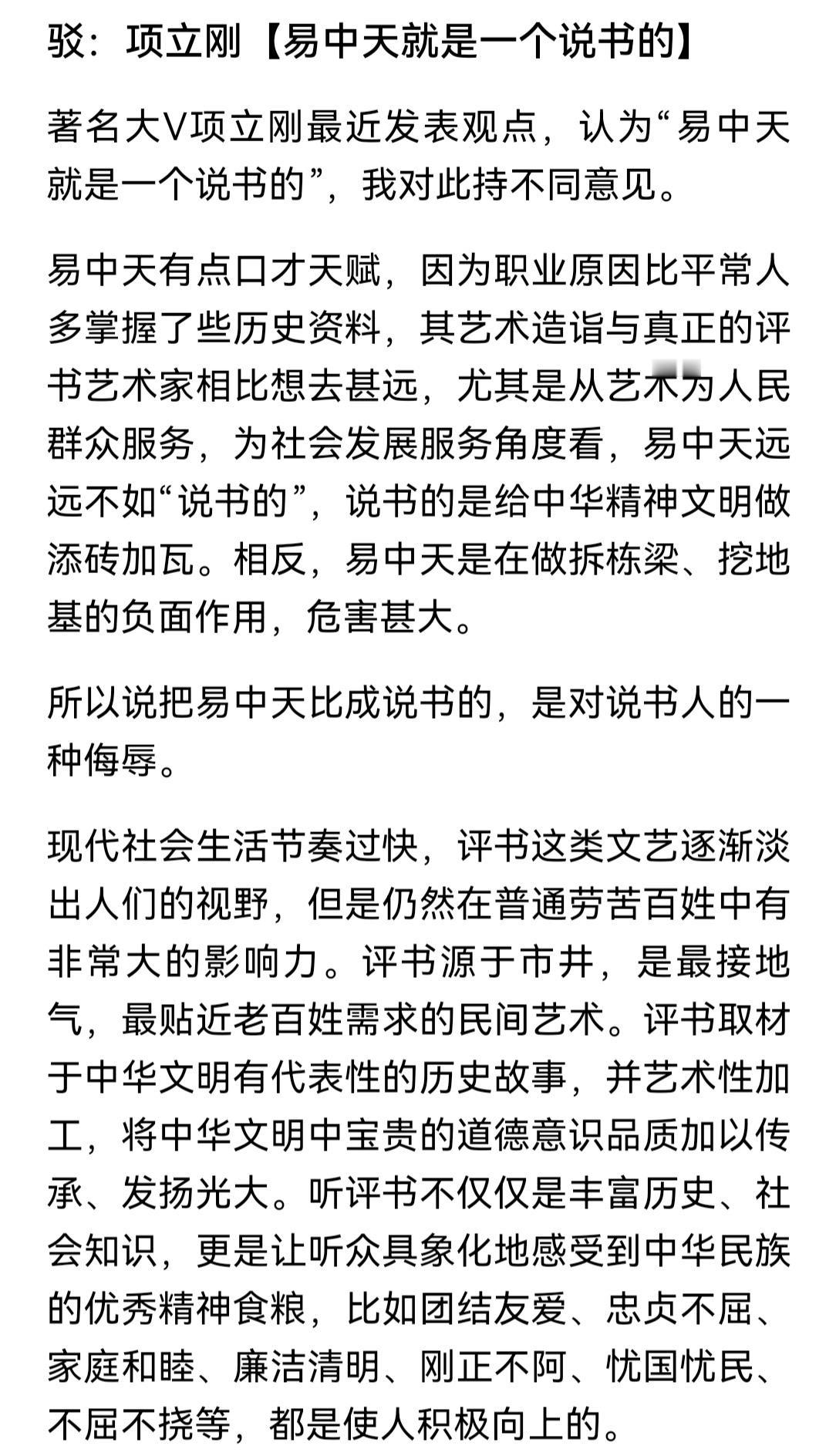 大郎说易中天就是一个说书的,言语间满是不屑。 易中天确实就是个说书的,没问题啊!他如何出名的?易中天说三国呗,他说说他对三国的看法,没什么不妥,你愿意你也可以说,都是一家之言,赞同就挺不赞同就不听,没人强迫。 有人出来说:他说的东西不正确,对教育不利。扯,都是成年人,谁教育谁啊?你没事刷个视频是为了受教育的? 说书人怎么算成功?受欢迎,播放量高就是。至于易中天的三国受不受欢迎,查查当年央视百家讲坛就行。