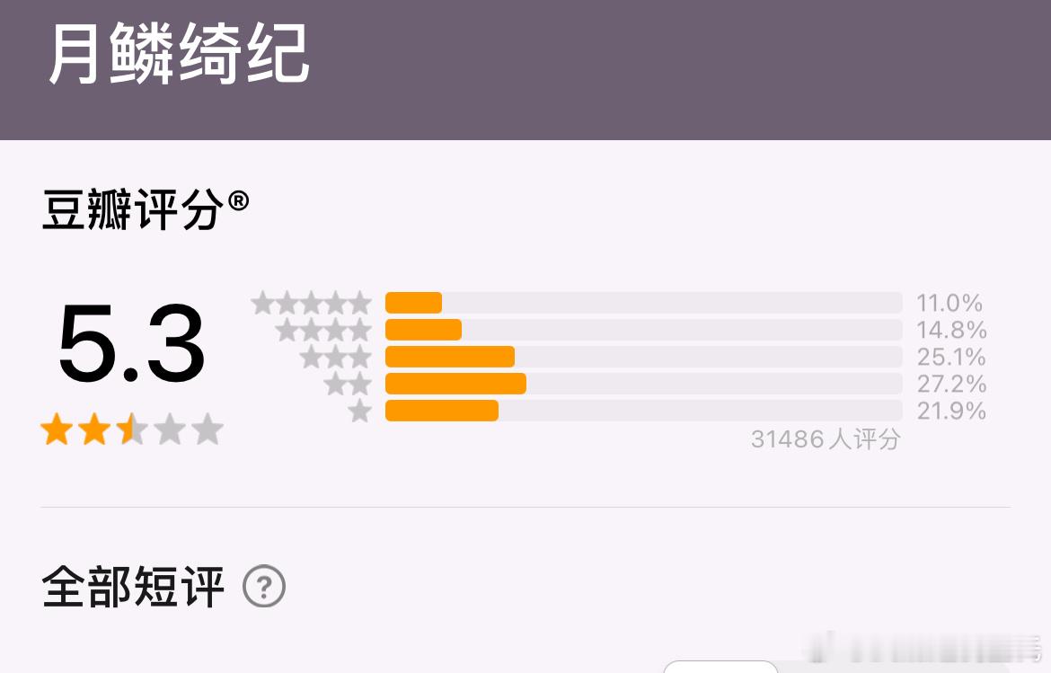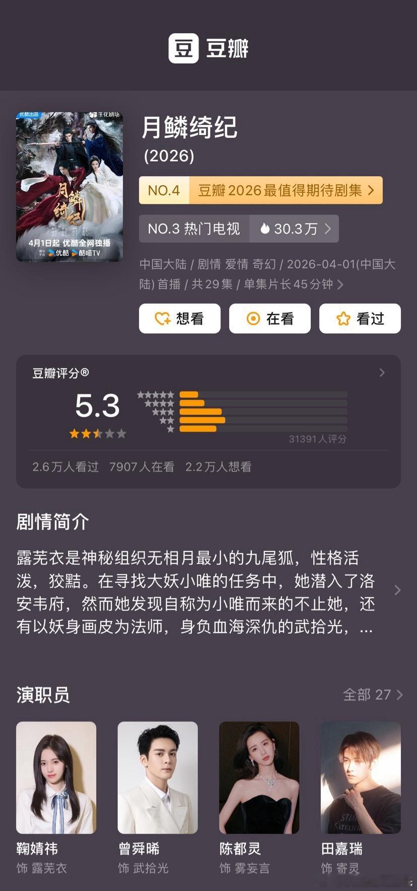 鞠婧祎、曾舜晞、陈都灵、田嘉瑞月鳞绮纪豆瓣开分5.3 评分人数3.1w,高了低了?二⭐️占比最高27.2%三⭐️占比25.1%一⭐️占比21.9%