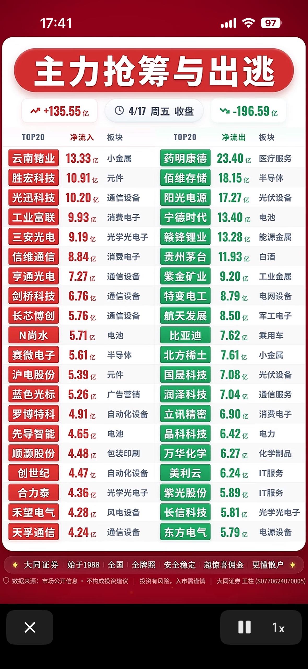 主力抢筹与出逃,今日大盘走势分析!📈📉 4月17日周五的股市行情真让人摸不着头脑!单看指数,沪指微跌、深成指和创业板指还涨着,创业板指更是创出近11年新高。可一看个股,近4000家下跌,涨跌比接近1:3。两市成交额24256亿元,比昨天放量839亿,连续8天站稳万亿以上。 午盘时,沪指精准收在4043.45点,跌0.30%,深强沪弱分化到极致。上涨1644家,下跌3774家,赚钱效应全面崩塌。主力净流出明显,高位题材股还出现批量跌停。这行情太反常,不是简单洗盘,感觉要变天了。下周怎么走很难说,散户还是谨慎为妙,控制好仓位,别盲目追高抄底。