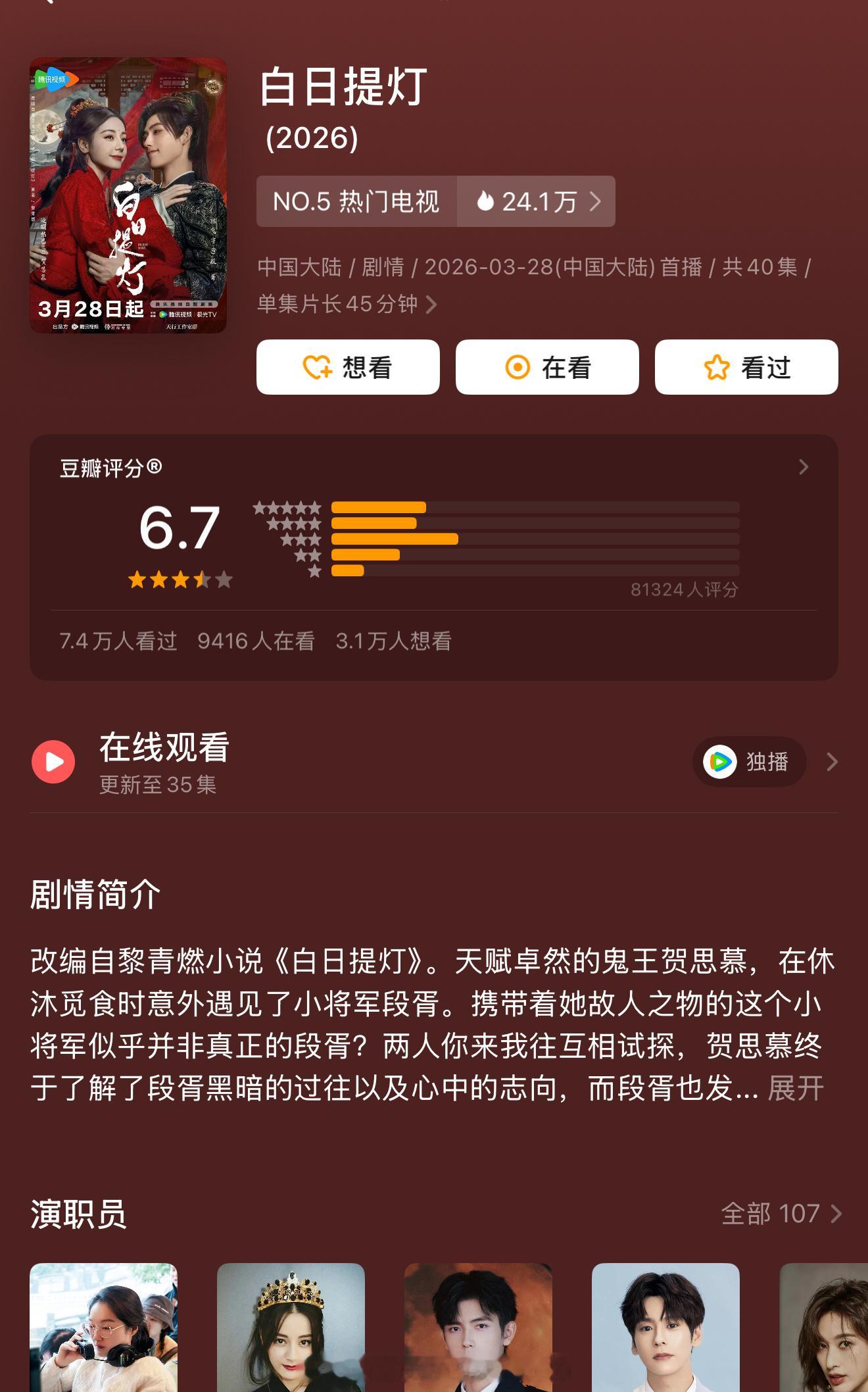 迪丽热巴陈飞宇《白日提灯》豆瓣开分6.7分,8万➕人评分,大家觉得符合预期吗?!