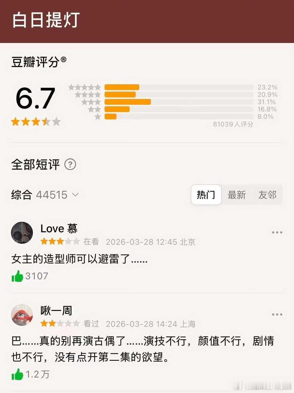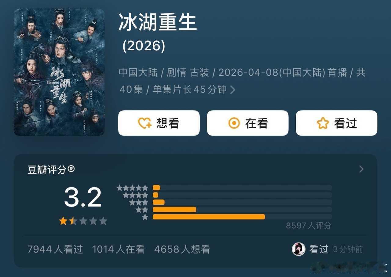 最近剧集评分李昀锐 黄杨钿甜《冰湖重生》3.2鞠婧祎 曾舜晞 陈都灵 田嘉瑞《月鳞绮纪》5.3迪丽热巴 陈飞宇《白夜提灯》6.7我看谁还再说热巴扑了!