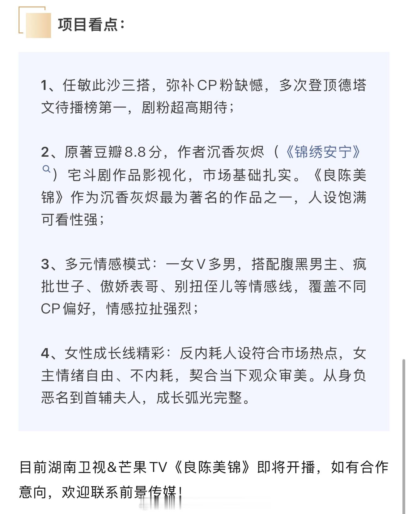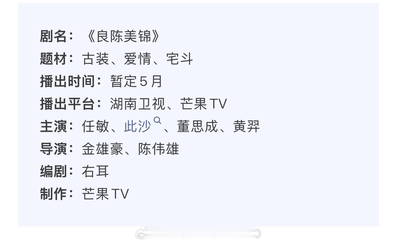 任敏、此沙、董思成《良陈美锦》开启播前招商,预计5月在湖南卫视/芒果tv播出!!