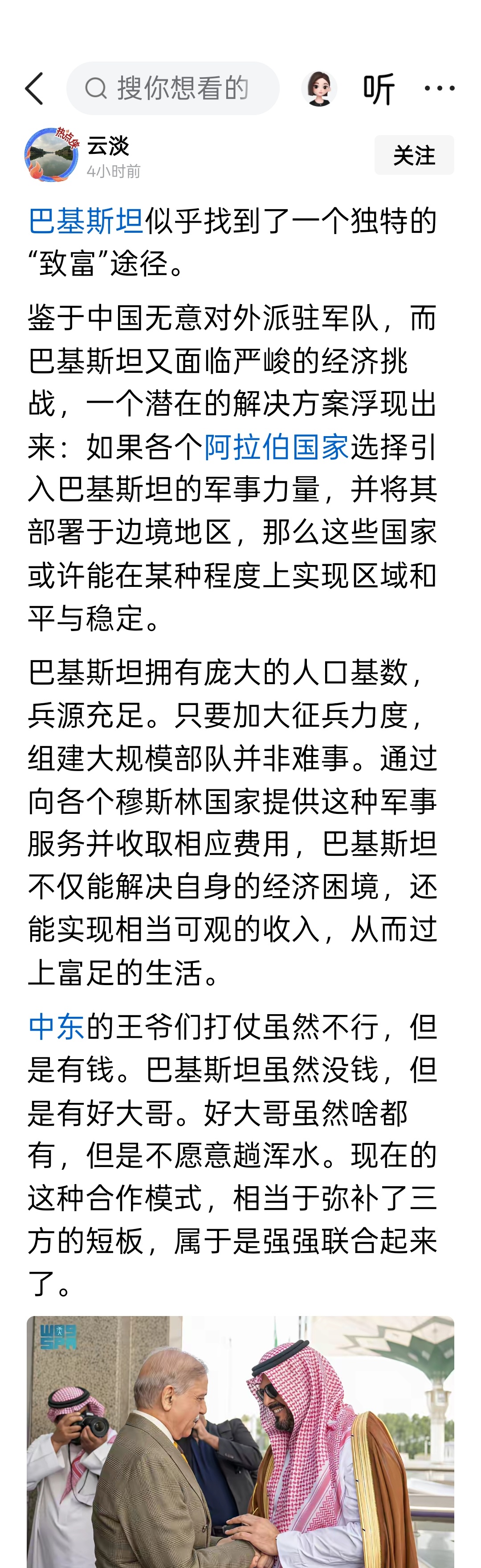 此计甚好!出现了三赢的局面!第一,解决了中东王爷的安全问题,他们虽然有钱,但是时刻面临着别的国家薅羊毛威胁。第二,解决了巴基斯坦的经济困境,由巴基斯坦提供保护,中东各国只要努力发展经济就行了,不用再把钱投到军备上来了。第三,由中国提供科技支持,推进武器科技更新迭代