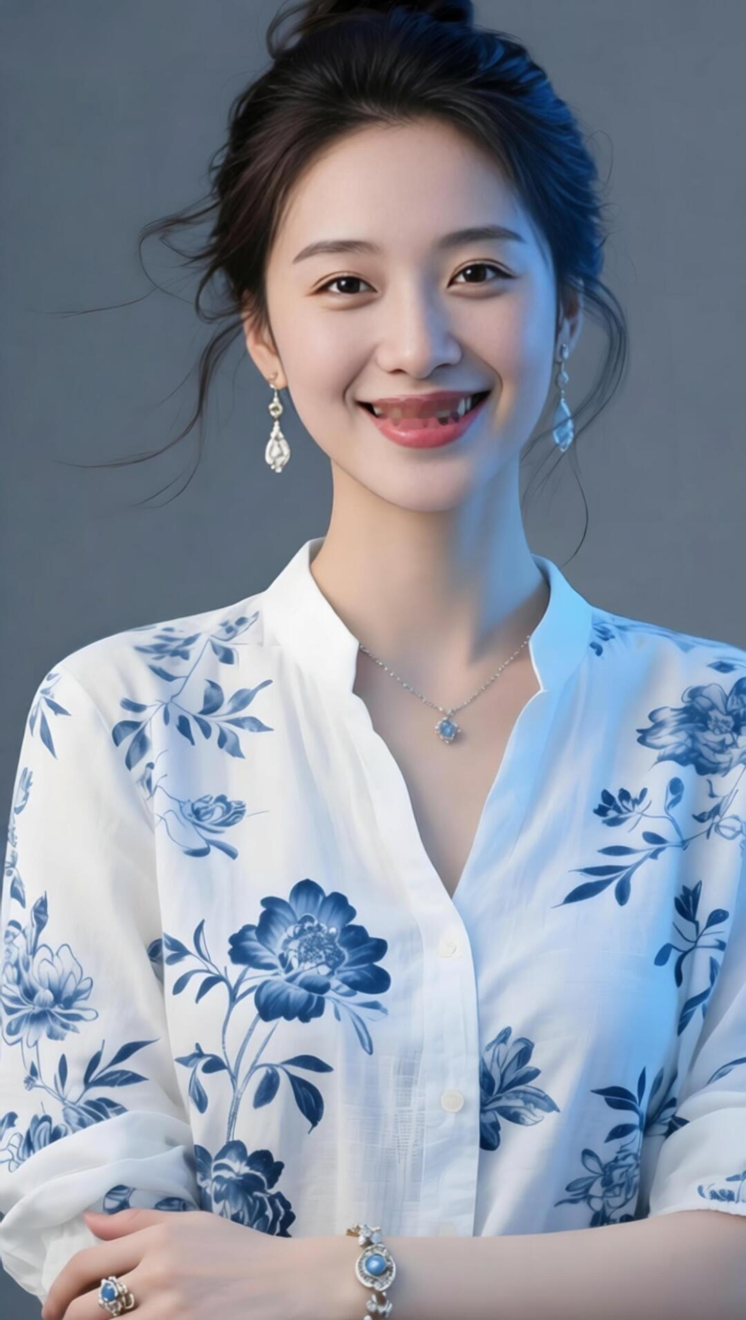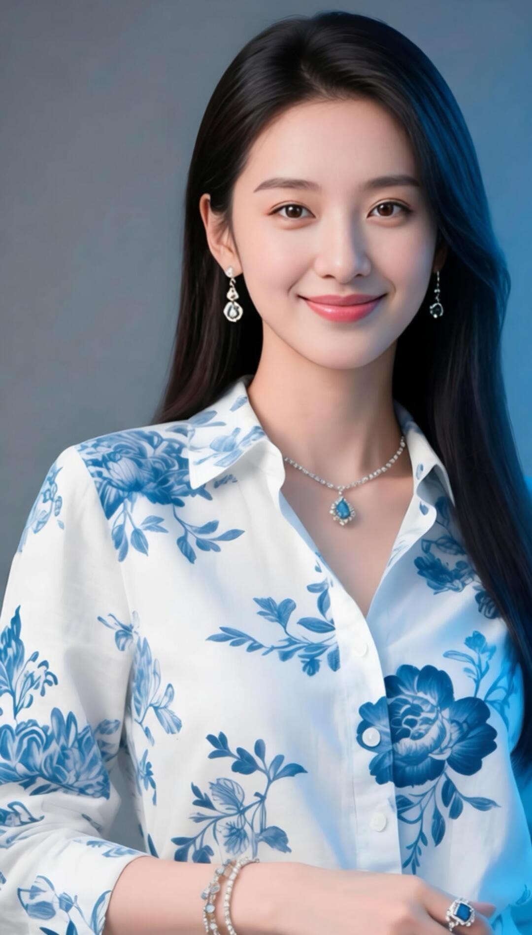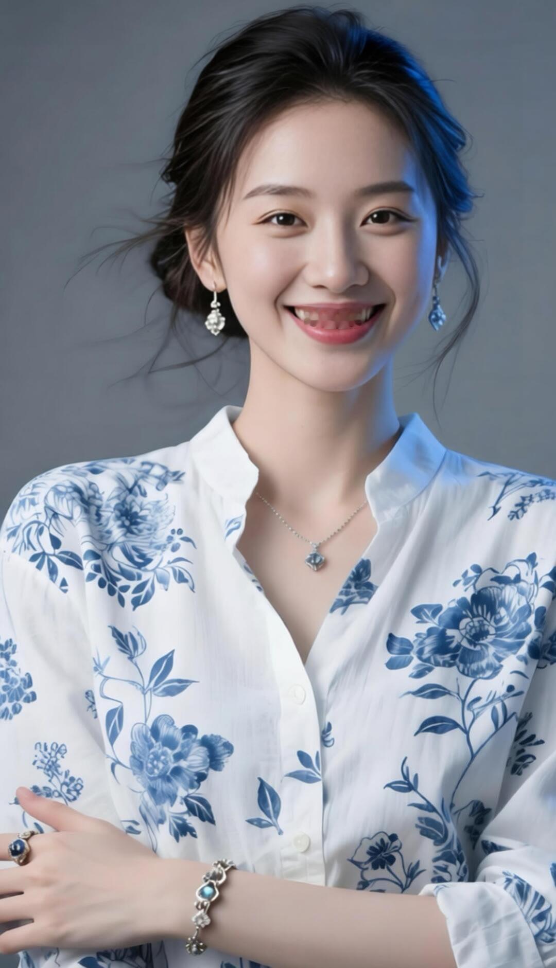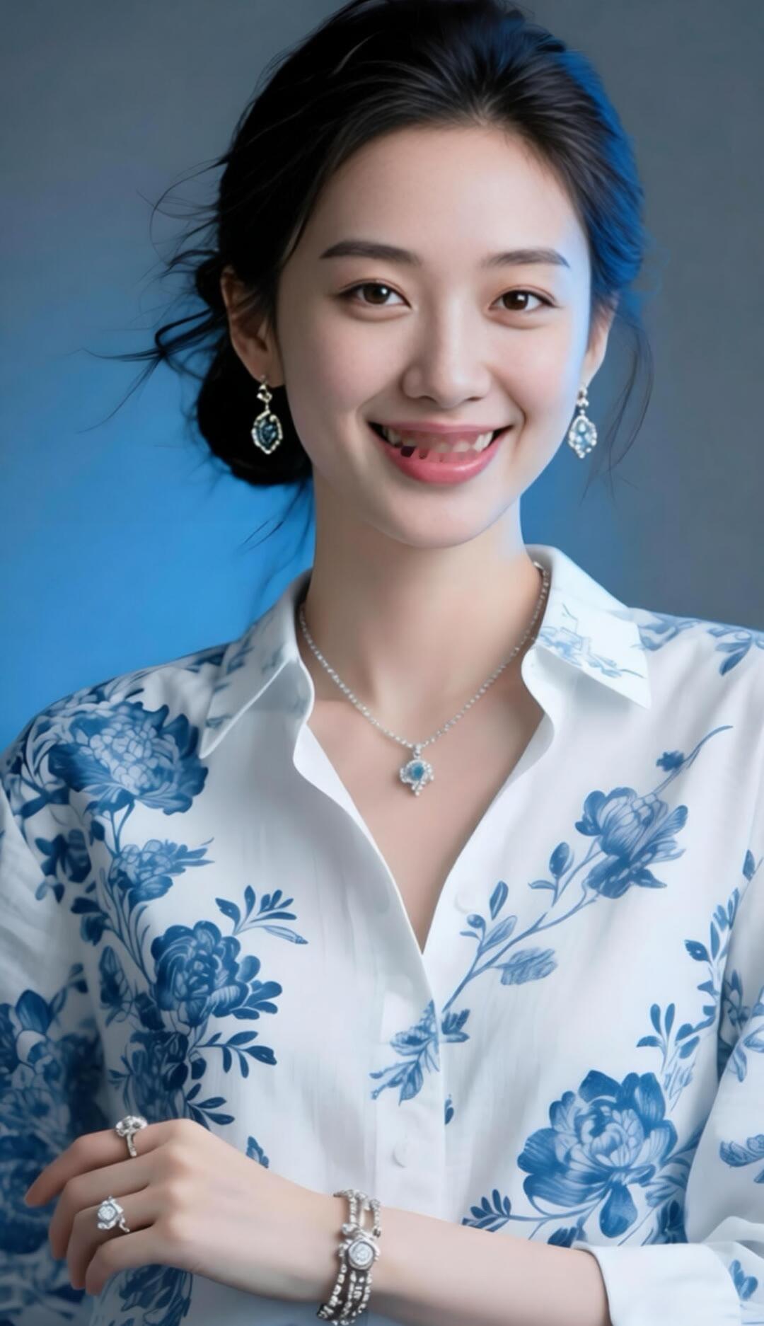 优雅蓝花衬衫,甜美笑容,闪耀珠宝,时尚穿搭