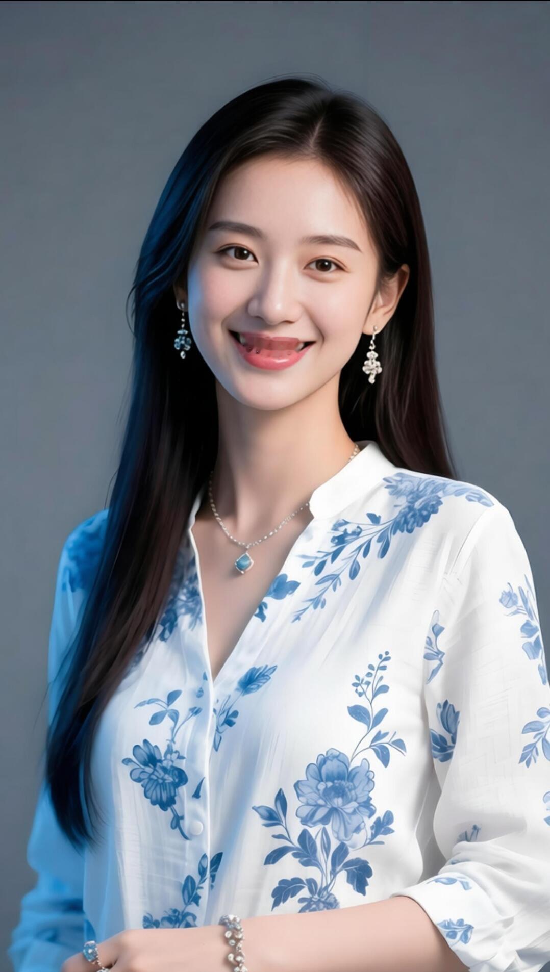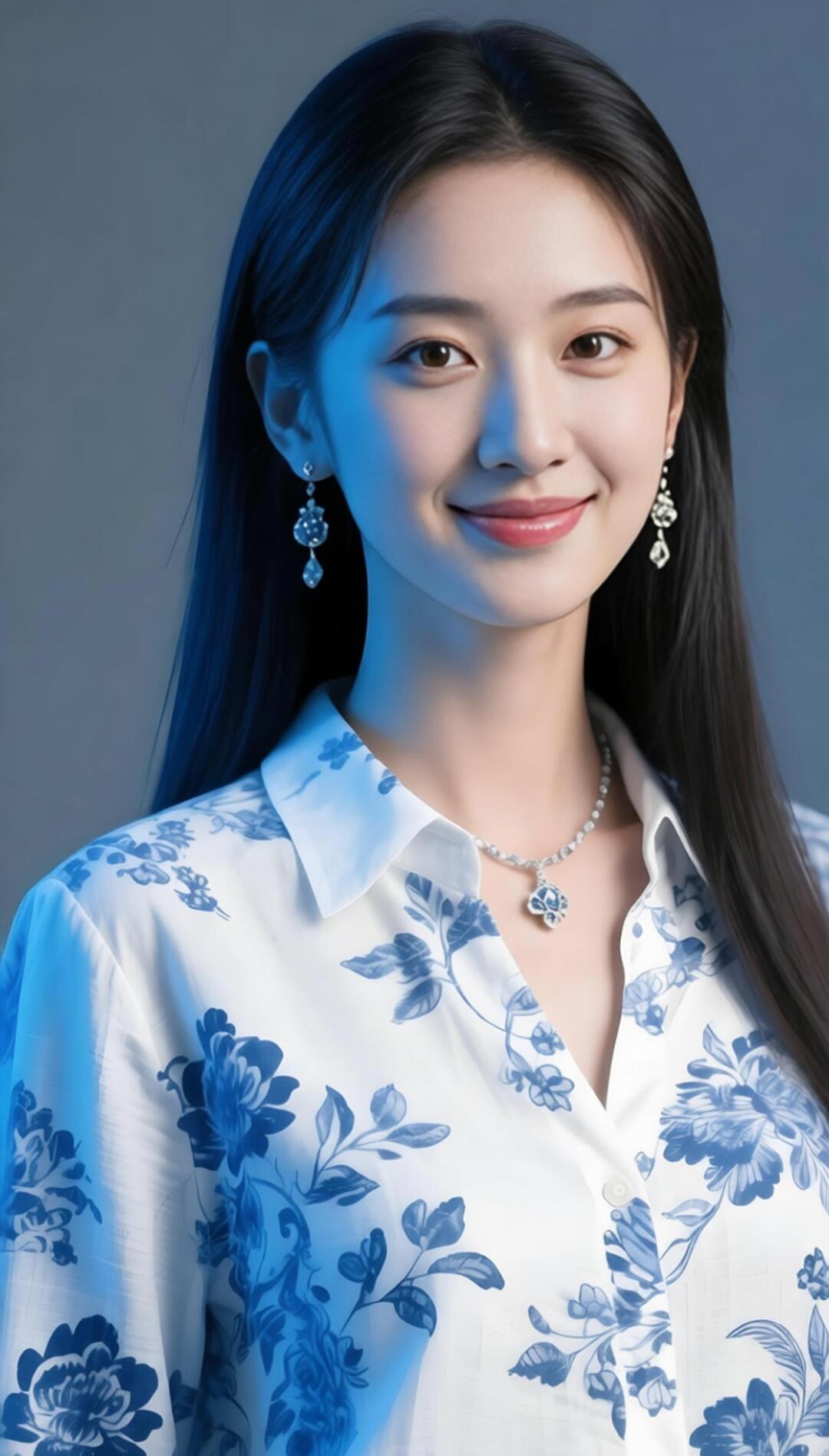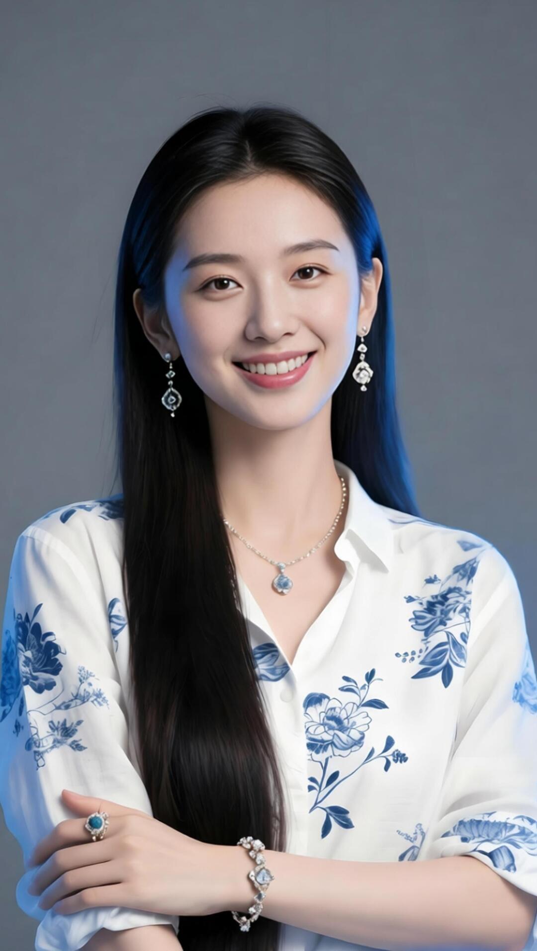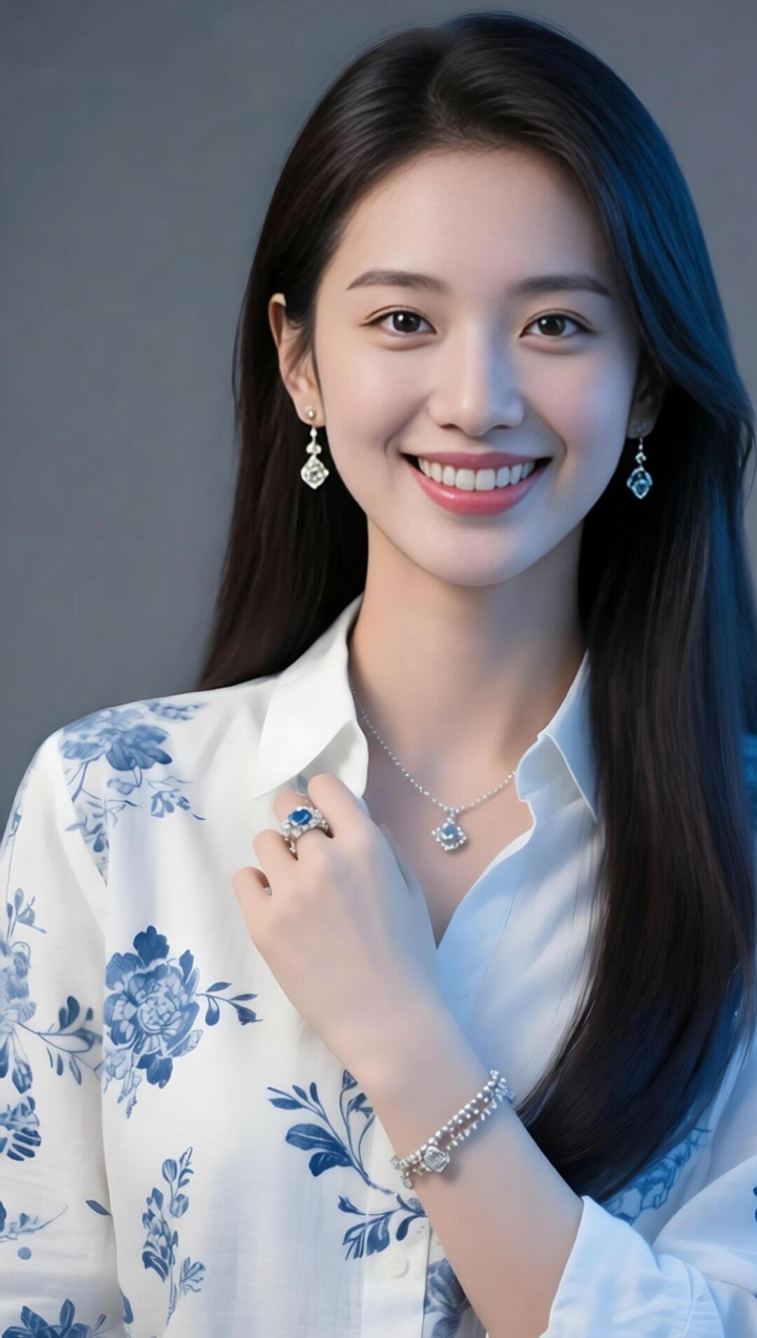 优雅蓝花衬衫,甜美笑容,闪耀珠宝,时尚穿搭