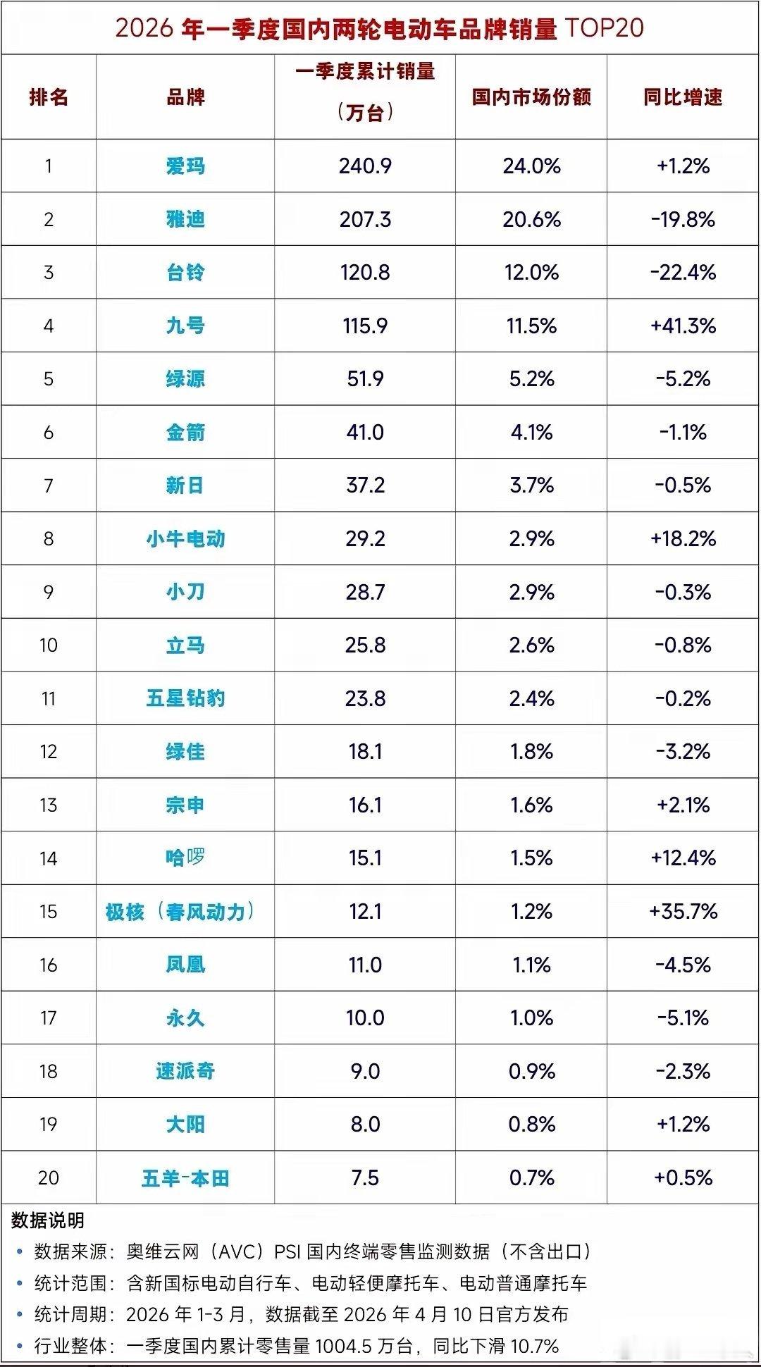 两轮电动车的智能化竞争也很厉害了!一季度增长最快的是九号、极核和小牛。有意思的是,传统老大雅迪居然被爱玛超越了。