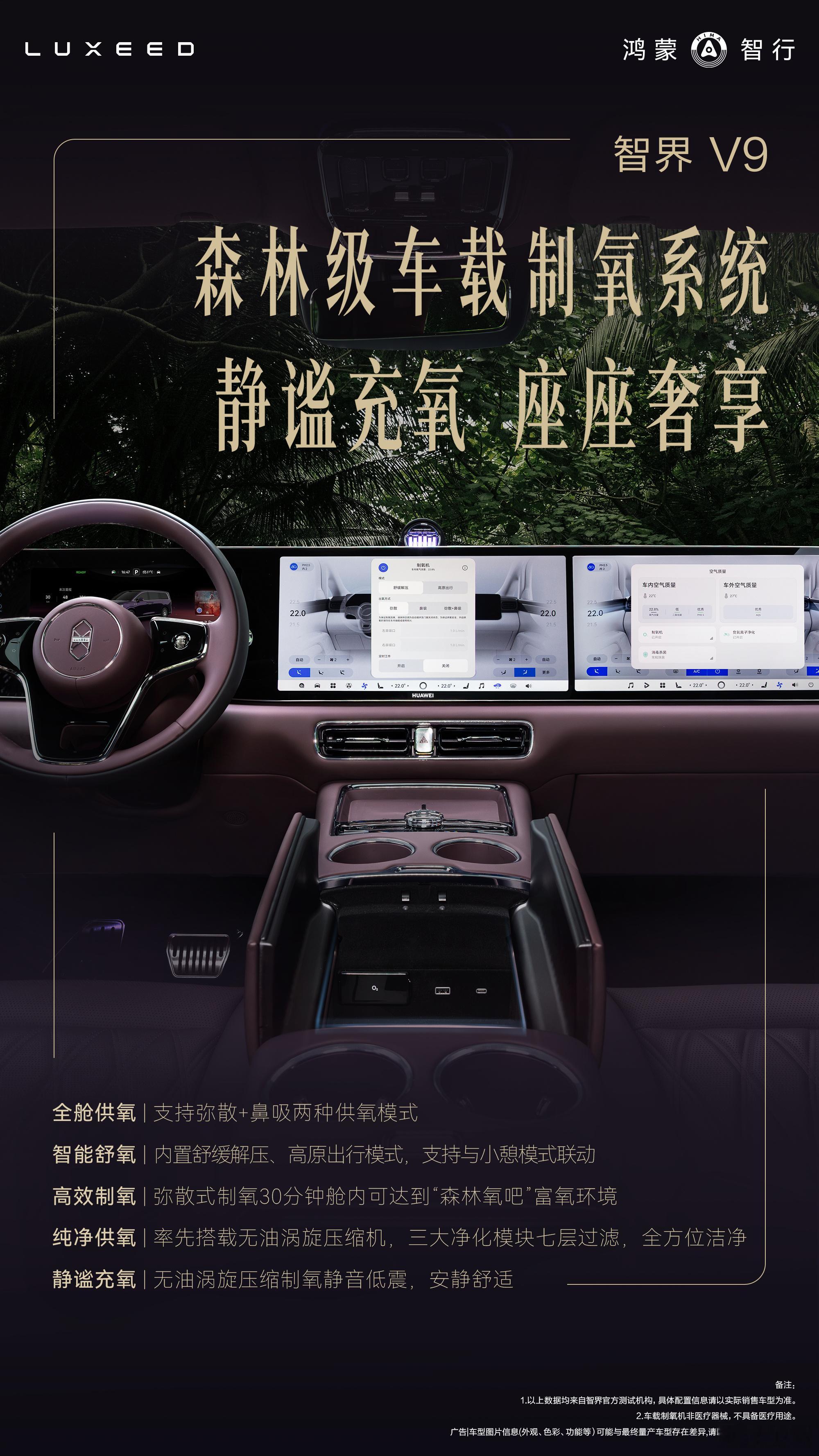 智界V9搭载车载制氧机黑科技,支持弥散+鼻吸双模式制氧,仅需30分钟舱内可达到森林般的富氧状态,大大缓解长途驾乘的疲劳感。